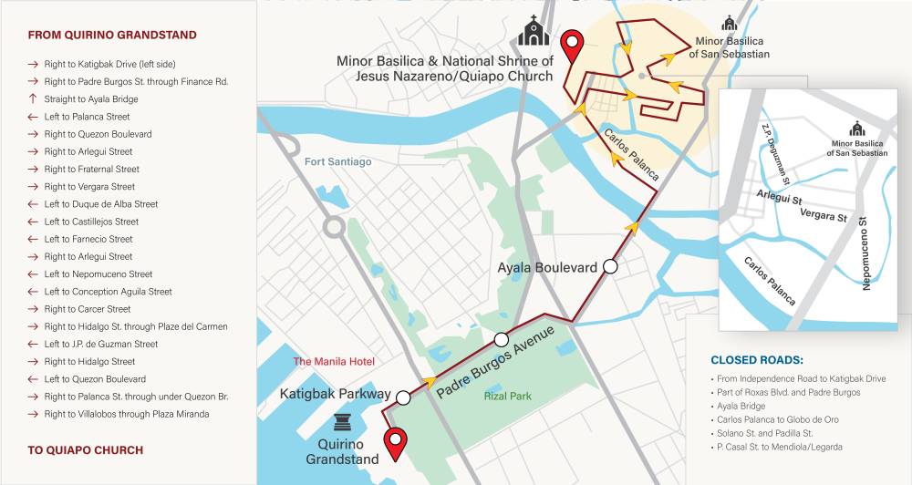 This Jan. 8, morning masses are scheduled at Quiapo Church every hour from 5 a.m. to 10 a.m. and at 12:15 p.m., followed by fiesta masses every hour from 3 p.m. to 11 p.m. Meanwhile, at the Quirino Grandstand, a band parade will start at 3 p.m., Panalangin sa Takipsilim at 5 p.m., followed by the vigil program.