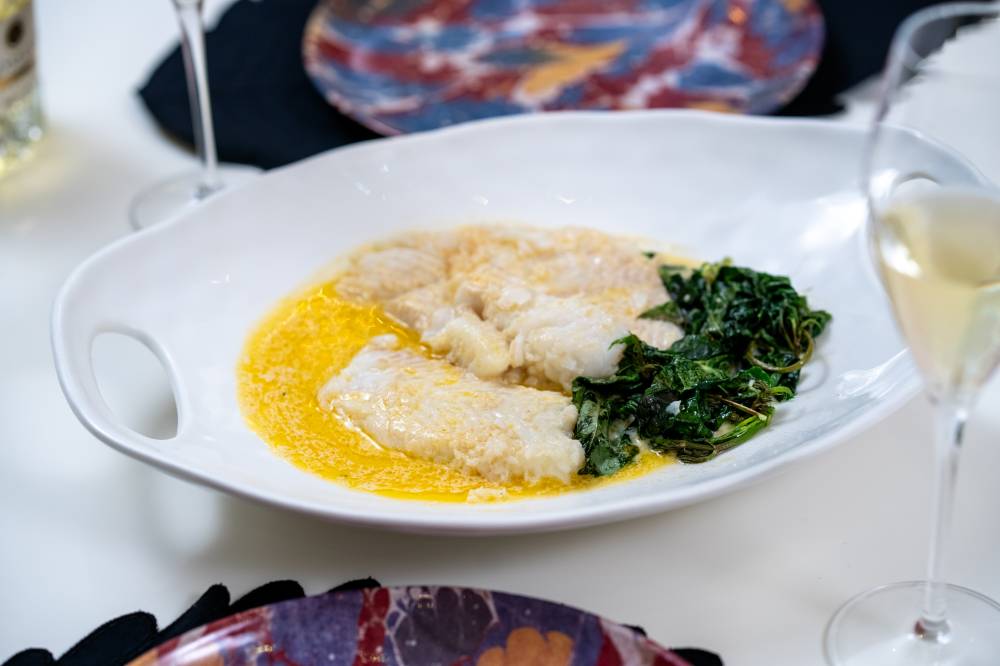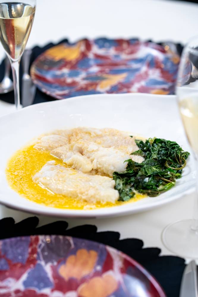 5. Plate and finish. Nestle seabass over spinach, spoon brown butter dashi cream over the fish