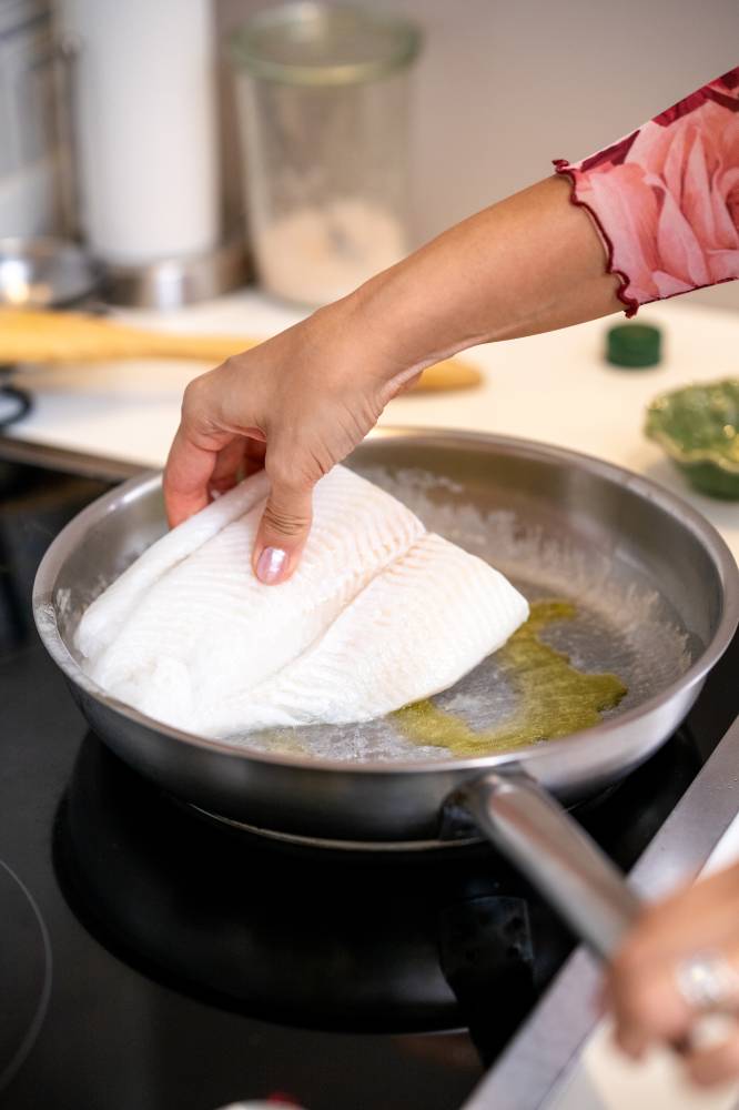 3. Pan-sear the halibut. Heat a non-stick pan over medium. Lightly oil if needed. Sear halibut about 2.5 minutes per side (thickness-dependent) until opaque, just flaky at the center, and nicely browned.