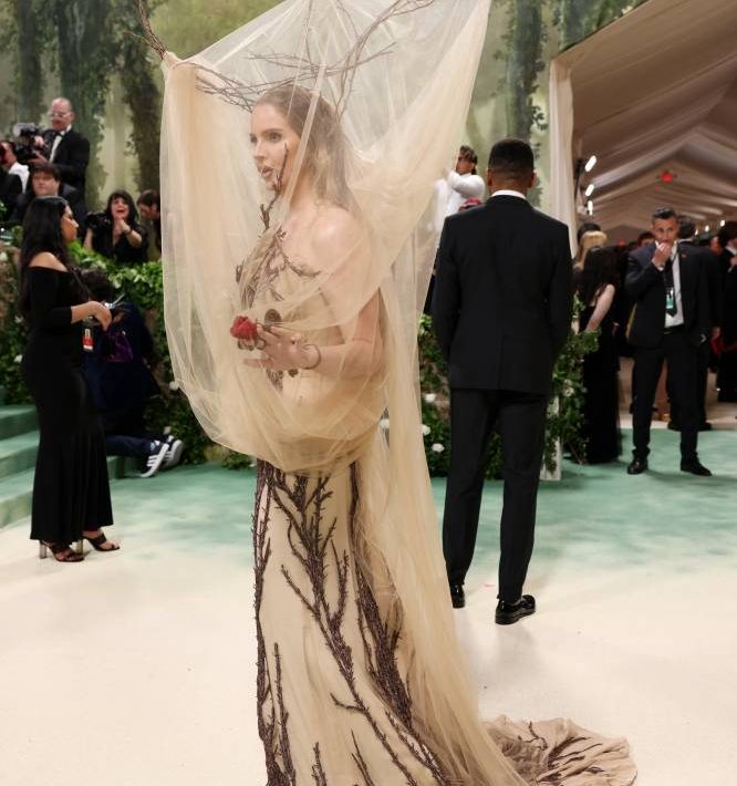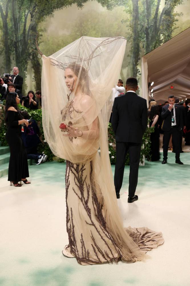 Some—such as singer Lana del Rey—emphasized decay, with stark sculptural twigs rising from her gown to hold a veil of tulle like a canopy over her head.