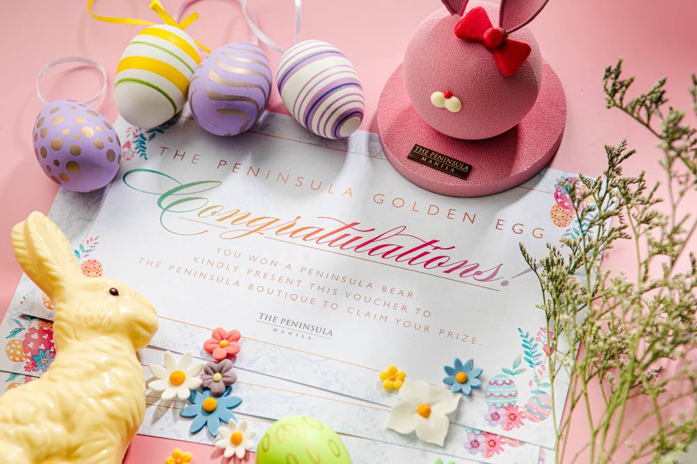 Mom and Dad can also enjoy a family escape in the in-room bubble baths, breakfast buffets each morning at Escolta restaurant, Easter nibbles from The Peninsula Boutique, at the hotel’s outdoor swimming pool and egg hunting when booking the Peninsula Easter Egg-venture Escapade room package. Rates start at P16,500 for a deluxe room.Take home a 4-kilogram limited-edition Peninsula Chocolate Golden Easter Egg with major prizes inside. Lucky winners will receive an overnight stay in an executive suite, a bottle of Peninsula Champagne, a P5,000 gift certificate, a Peninsula Bear and many more. Only 30 pieces are available for P6,000 each.