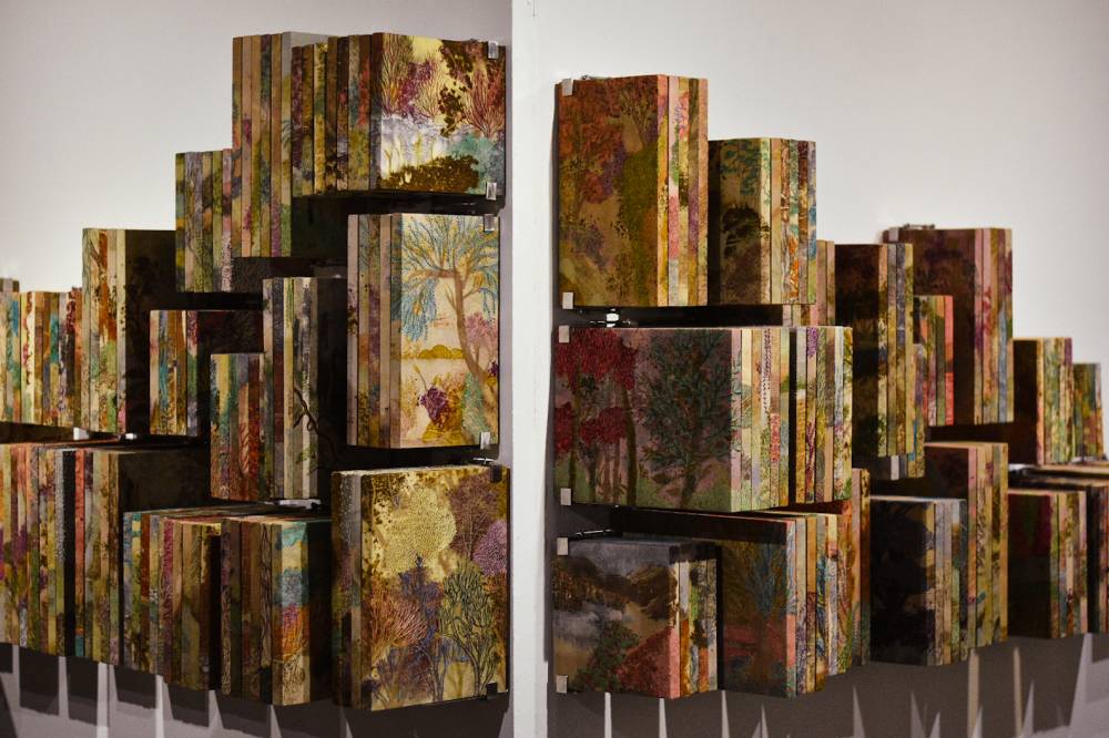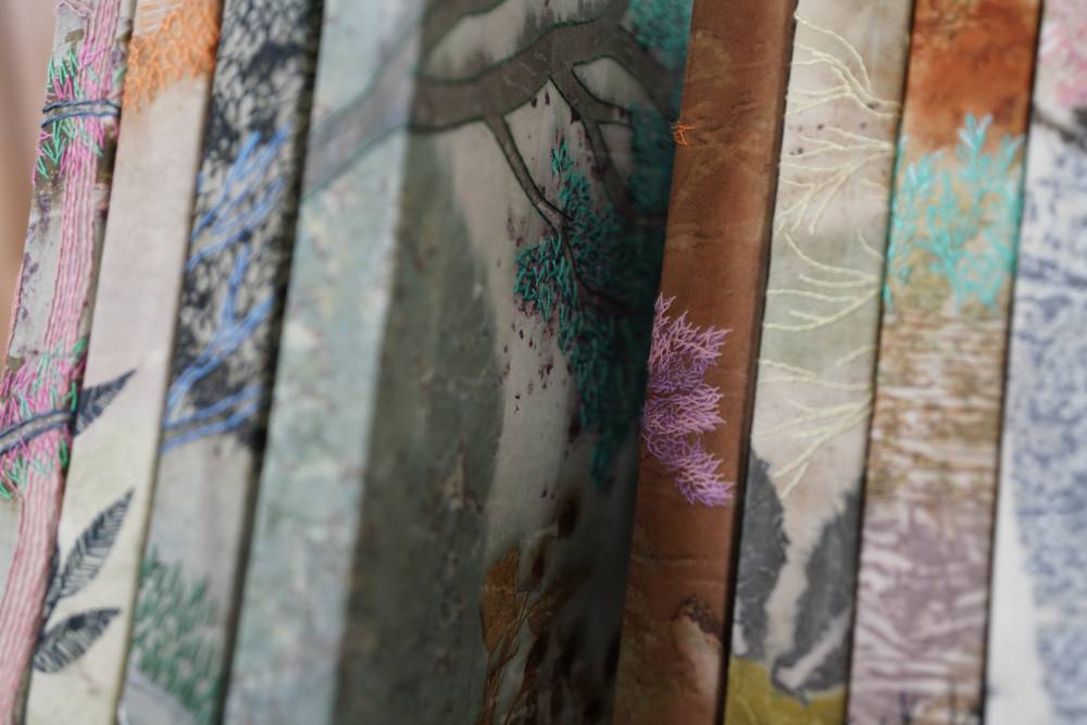 To understand the physical demands of producing such a painstakingly intricate and ambitious work, one must consider its making. Each of the 267 units of ecoprinted, polychromatic landscapes is compositionally sophisticated and elaborately embroidered.