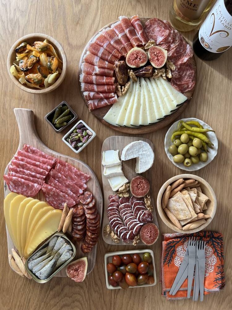 The food can be varied: cheese and charcuterie, conservas (tinned seafood), dips, tostas, cooked chorizo, nuts, fruit, pickles, olives, crudites… no limits! The key is that they are generally “small bites” that can be easily eaten, and that they are all shared.