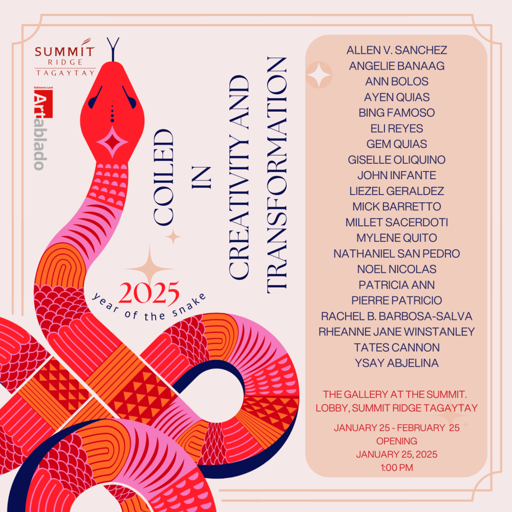 Get ready for a truly mesmerizing experience as “Coiled in Creativity and Transformation” unfolds at The Gallery @ Summit in Summit Ridge Tagaytay. The monthlong exhibit opening Jan. 25 showcases a diverse array of artworks inspired by the Year of the Snake, reflecting the theme of metamorphosis, growth, and artistic evolution.