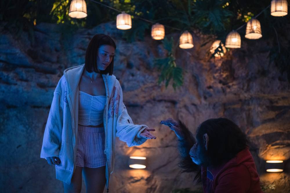 Most of Primate’s Act Two is just a cat and mouse game (more ape and human) on how to survive this horrific situation. Director Johannes Roberts keeps the thrills simple. Trapped in a swimming pool—because Ben can’t swim and is afraid of water—Lucy (Johnny Sequoyah) and her friends must figure out a way to get out and call for help. Their phones are scattered in a lavish house with many rooms, a house that Ben is very familiar with.