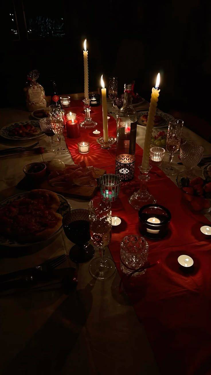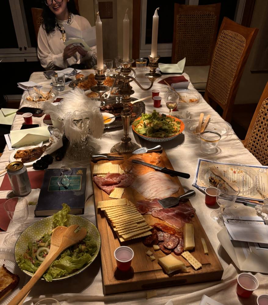 We dressed the table with a silver three-pronged candelabra for height and drama, then pulled out vintage silver trays from my grandmother’s closet to hold charcuterie, desserts as well as the envelopes with all the clues.
