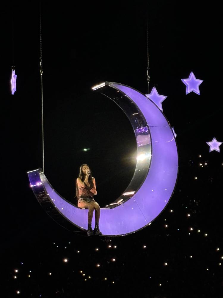And again, in the country-inflected guitar ballad, “Enough for You,” her favorite cut from her debut album, “Sour.” Suspended midair and perched on a purple crescent moon, Rodrigo—getting a clear view of the mammoth crowd from all angles and realizing the magnitude of the occasion—stopped singing for a second and put her hand over her mouth in disbelief.