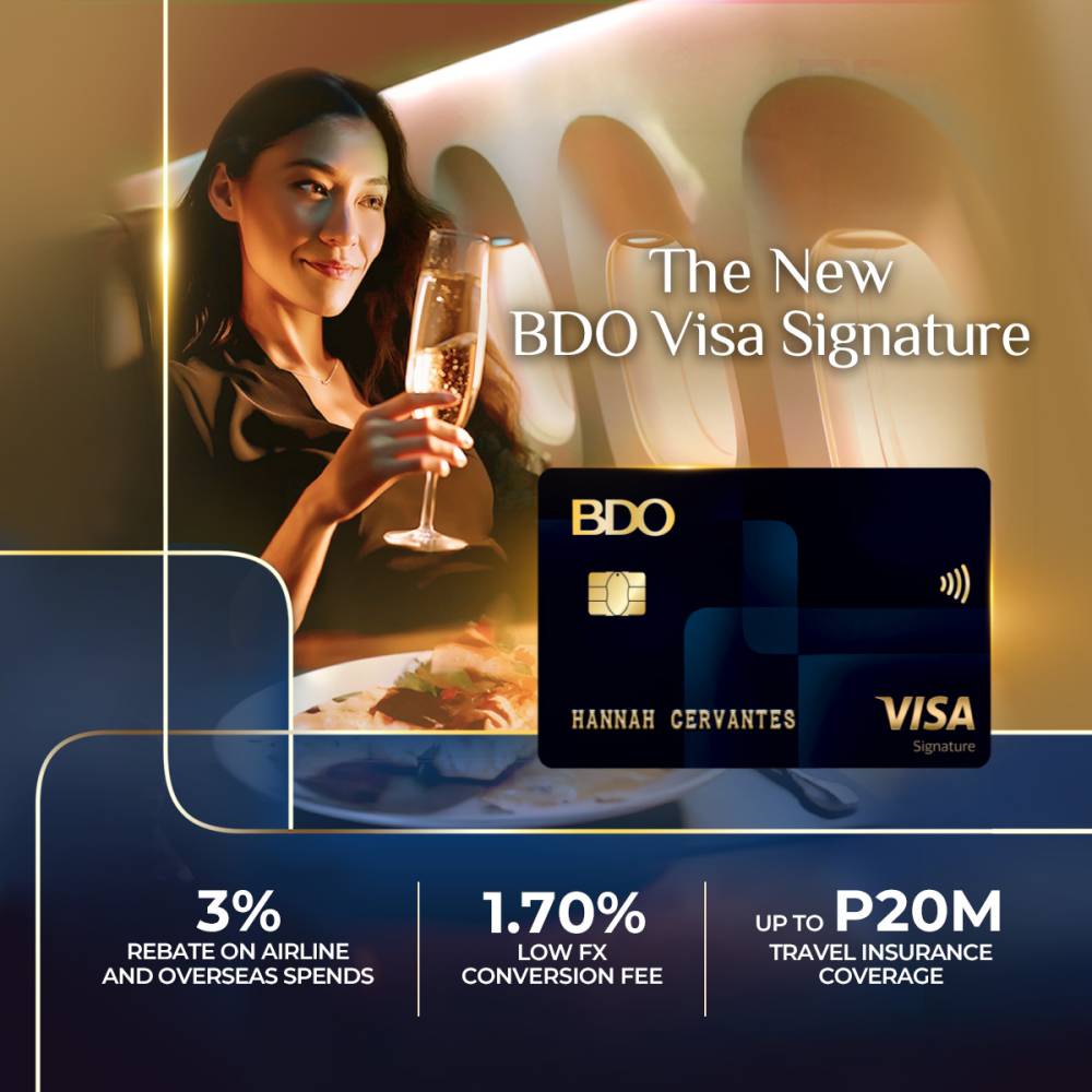“We always seek ways to provide our cardholders with better benefits and experiences. BDO Visa Signature is the perfect credit card for the elite traveler, offering generous travel rebates, low foreign exchange rates, exclusive access to VIP airport lounges, and comprehensive travel insurance. Our cardholders can expect to travel in style and comfort with these exclusive perks and privileges,” Tanchanco said in a statement.