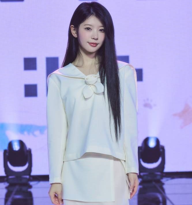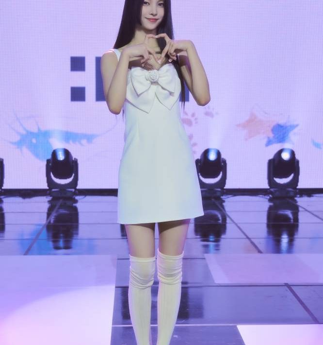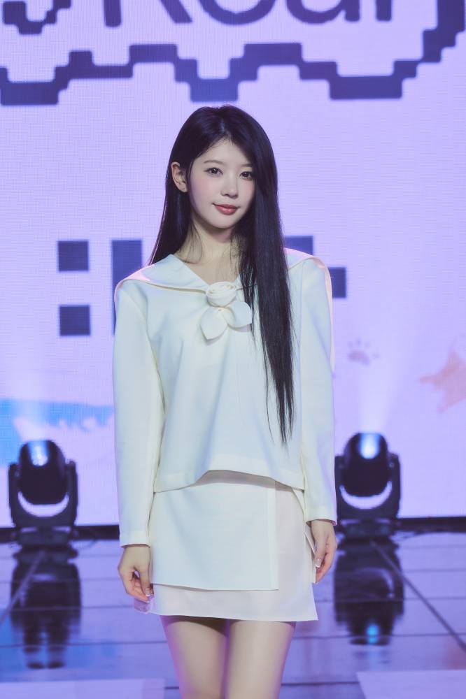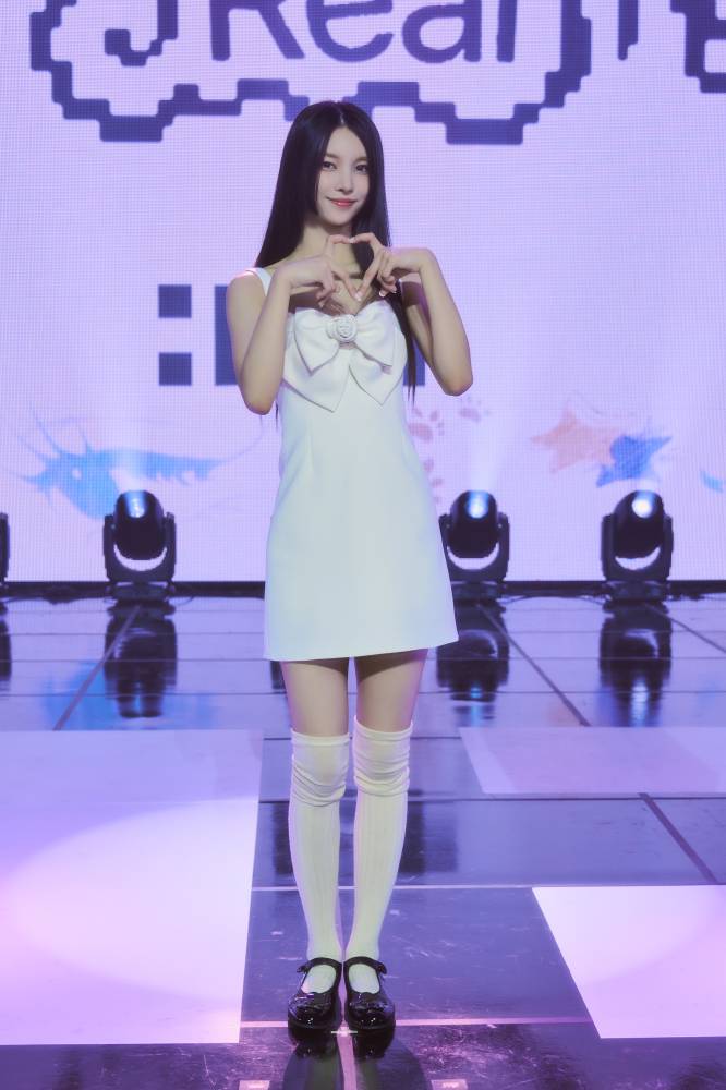 Yunah, 20, Minju, 19, Moka, 19, Wonhee, 16 and Iroha, 16, were presented to the press dressed in white and peach clothes. Iroha came out in a short satin off-shoulder dress with lacy shorts peeking underneath. Minju wore a peach vest over a white top and a peach skirt. Moka wore a white sailor top with a rosy bow and a short skirt and Wonhee had a long-sleeved mod dress on. Yunah wore a sleeveless number with a huge bow on her chest. All wore platform Mary Janes and white tights.