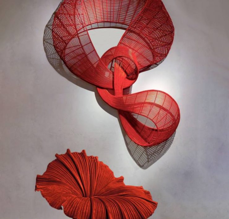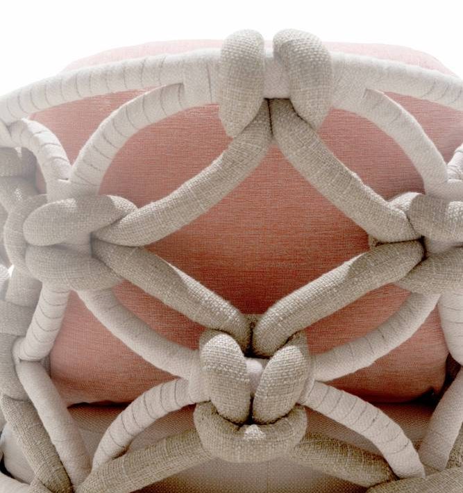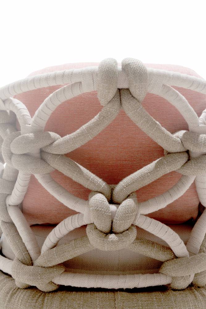 “Etré” is a collection of polyester tubes, covered with fabric, knotted to form geometric patterns and woven into graceful aluminum frames. The “Corda” is crafted with cotton rope twisted around a molded aluminum frame. As a striking decorative detail, it is coiled and twisted to create a floating pattern across a glass tabletop.