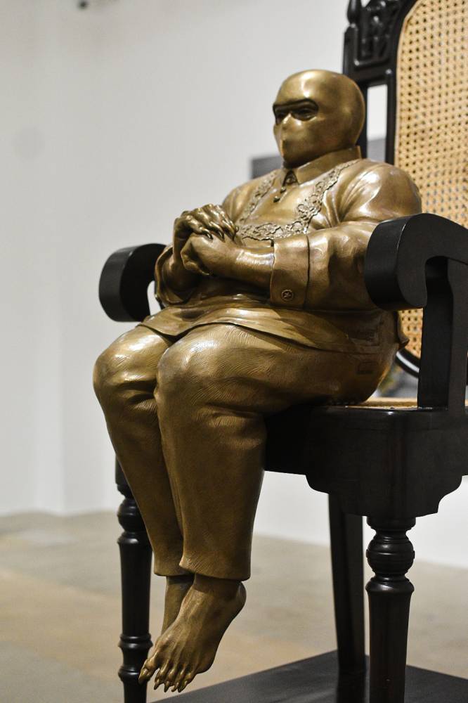 The exhibition even includes an expansive roster. Works by Filipino artists include a zoetrope, a pre-film animation device by Mark Justiniani as well as a powerful painting and whimsical sculpture by Bacolod-based artist Charlie Co. Leslie de Chavez presents an arresting sculpture of a rotund man in a barong Tagalog, donning a ski mask with nails like claws.