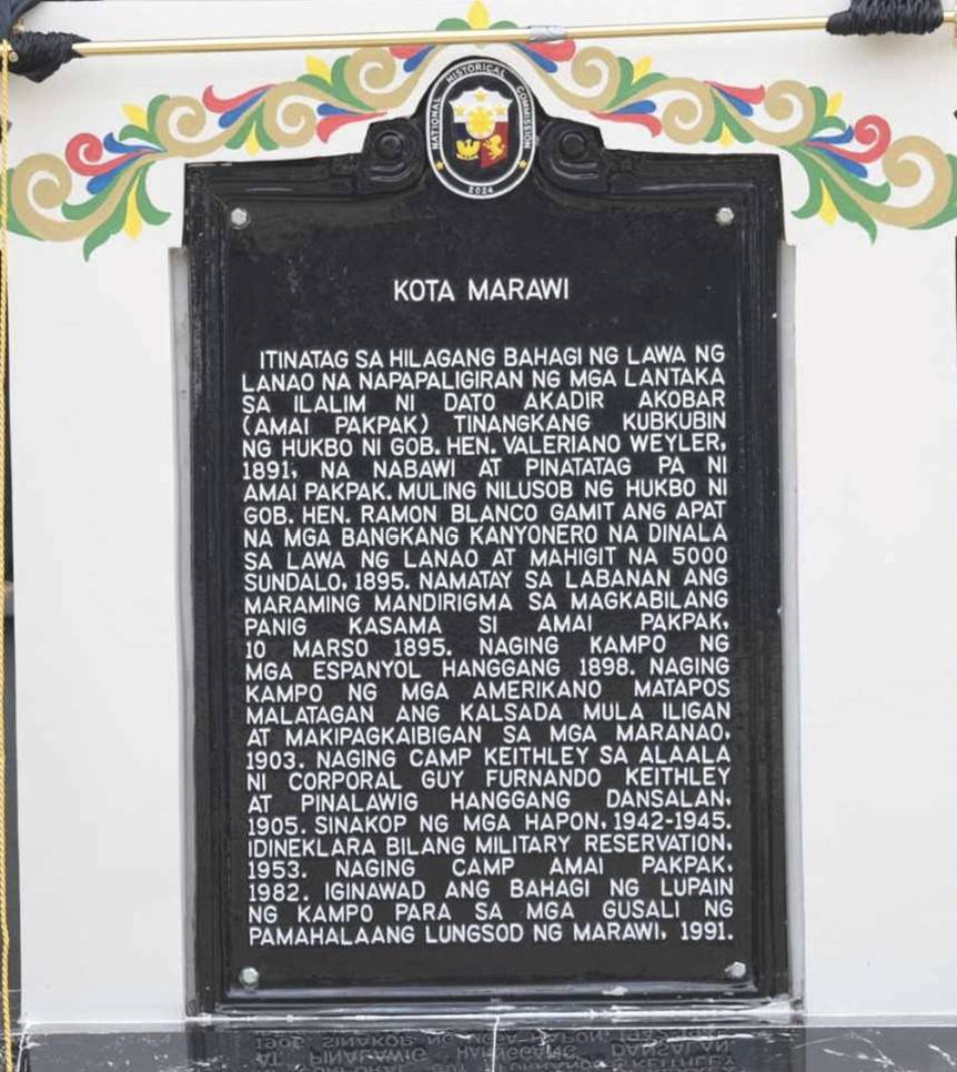 These markers are the “Labanan sa Marawi” and “Pagtatanggol sa Marawi,” installed at the Lanao People’s Park and Public Library, “Amai Pakpak” at the Amai Pakpak Central School, and “Kota Marawi” at the Marawi City Hall.