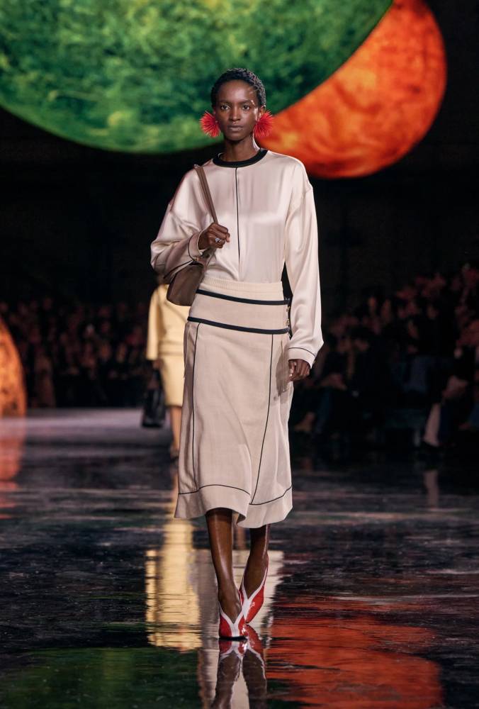 Gone were the boxy, over-embellished jackets of recent seasons. Instead, Blazy offered languid suits and softly structured separates: shifts that skimmed the body, side-split skirts, and matching jackets that moved with grace. Everything felt unburdened, visibly light, and unmistakably modern.
