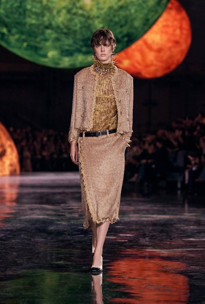 This global, almost anthropological lens gave the collection its depth. A rusty-brown tweed skirt with a fringed hem was paired with an embroidered shell top that shimmered like coral. Flowing ball skirts bloomed with spiky, Flemish-inspired flowers. These were not mere embellishments; they were expressions of Chanel’s universality, of cultures and crafts in dialogue.