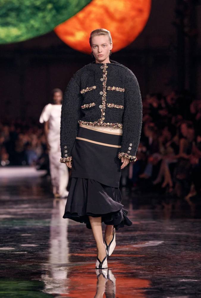 I woke up early Tuesday to a frenzy of posts from Paris Fashion Week’s show finale: Reels, clips, and images straight from the runway spamming my feed after Matthieu Blazy’s Spring-Summer 2026 show for Chanel. The Grand Palais had been transformed into a cosmic theater with glowing planets hung from the dome, reflections rippling across the runway like a Milky Way—a sense that Chanel had been launched into a new universe entirely.