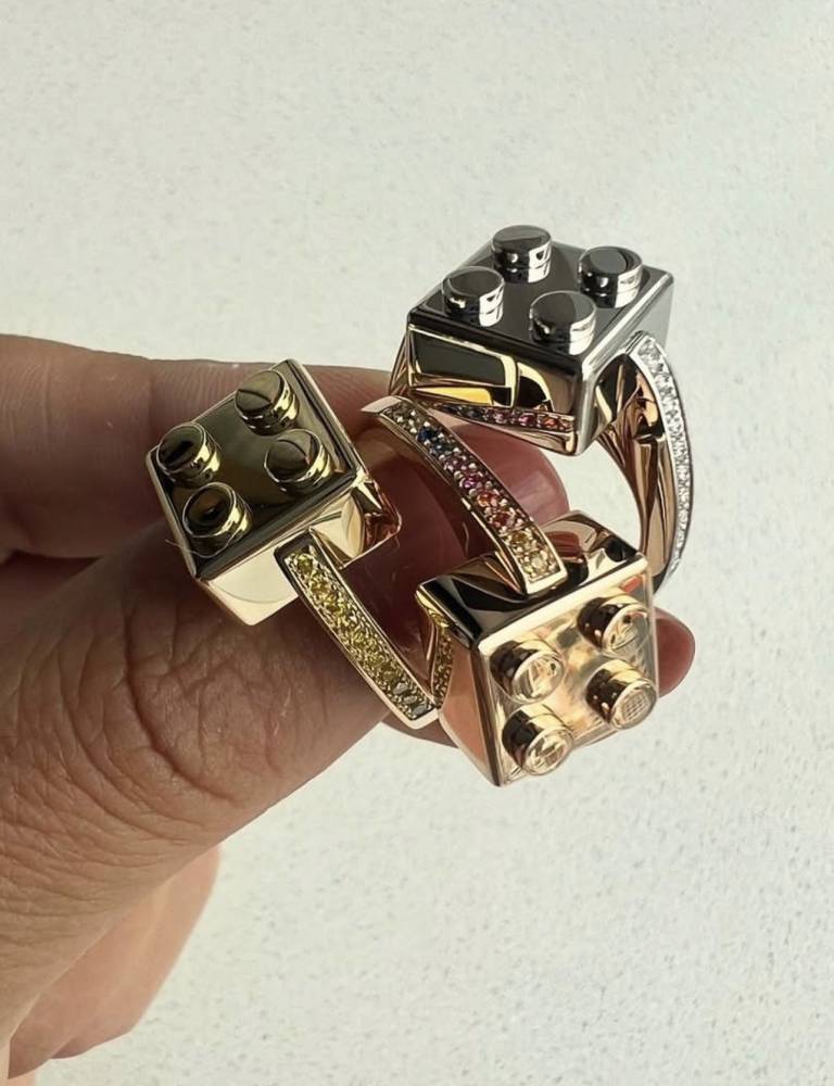 Their jewelry isn’t about playing it safe—it’s playful, bold, and seriously creative. Their designs are things you’d never imagine as jewelry, like a stackable burger ring with diamond “sesame seeds” or a crayon bracelet and Lego rings that nod to your inner kid.