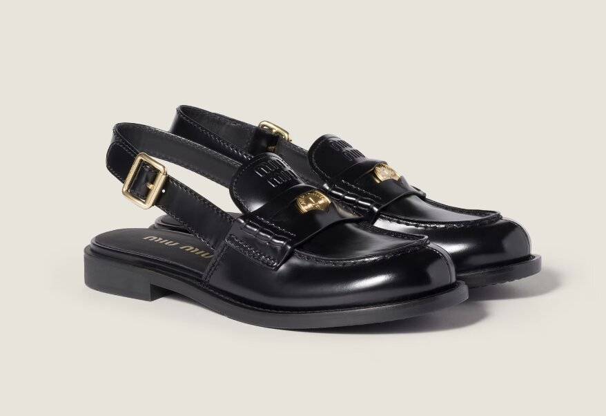 In true Miu Miu fashion, the brand takes the penny loafer quite literally by adding an actual coin detail across the strap. It is a playful gesture that nods to tradition without taking itself too seriously. And when worn with a pleated skirt, cropped trousers, or even socks for a slightly offbeat twist, the slingback version feels youthful. It softens the loafer without stripping it of character.