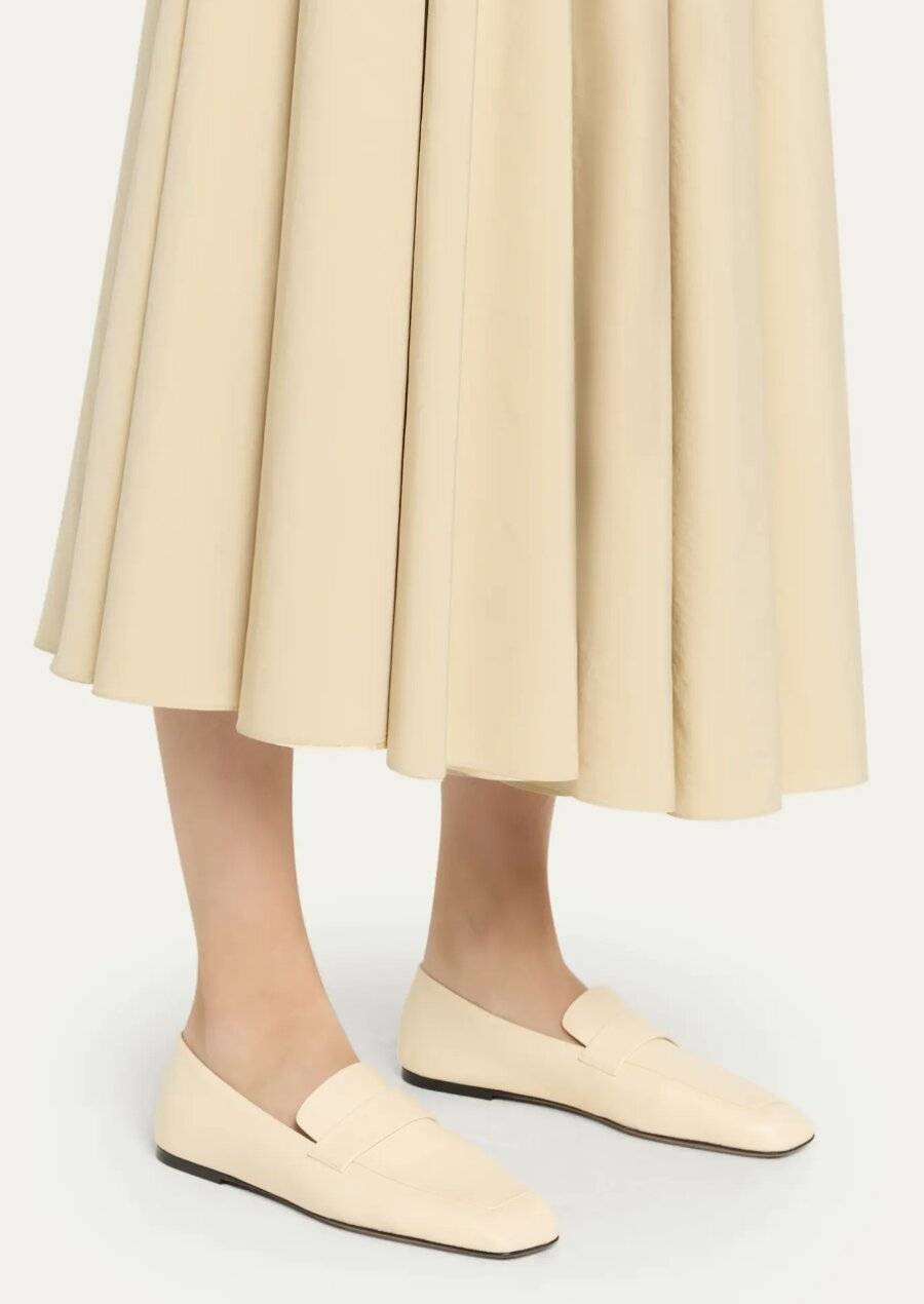 The square-toe loafer from The Row takes a completely different approach. Where chunky styles rely on weight and hardware, this silhouette is defined by sleek minimalism. The clean, extended square toe feels architectural, giving the shoe a modern, sculptural quality.
