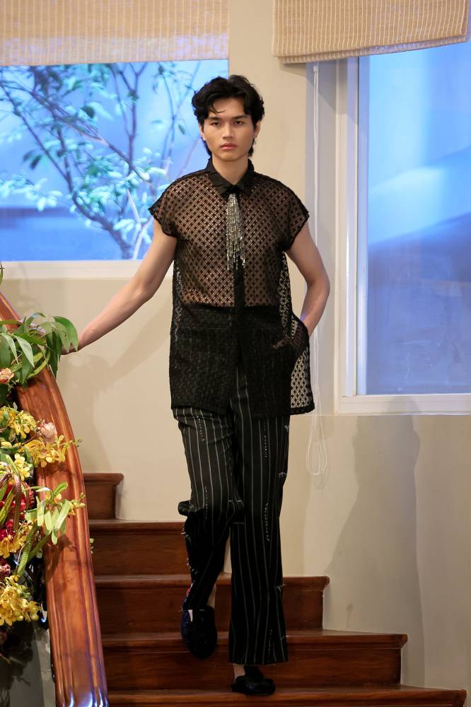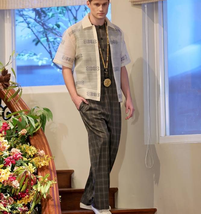 The sinuksok, an embroidery method of inserting colored threads to make patterns, was interpreted as a colorful trim that added contrast to a beige piña shirt. A black barong with rosettes was designed for the metrosexual and the young at heart.