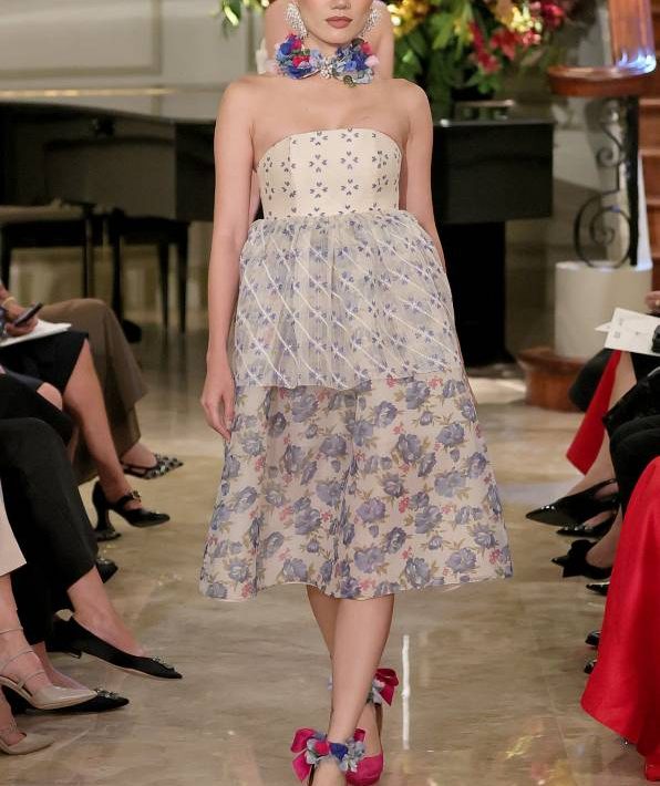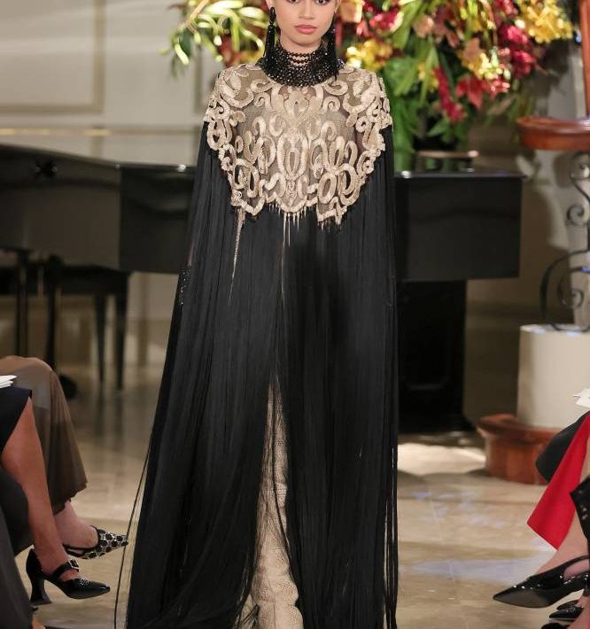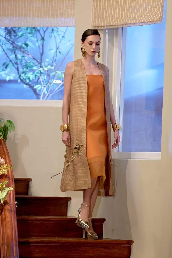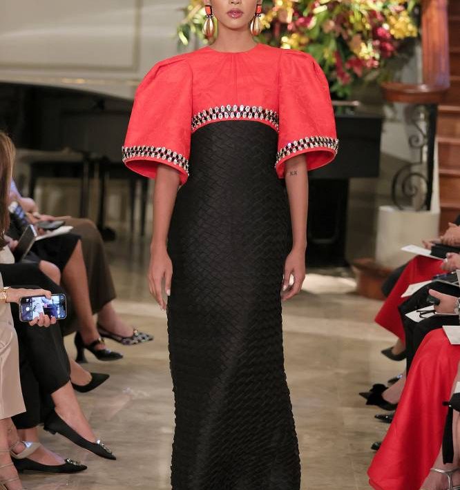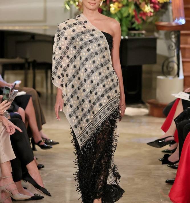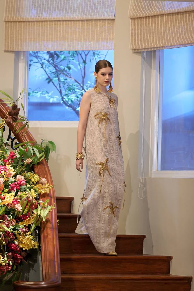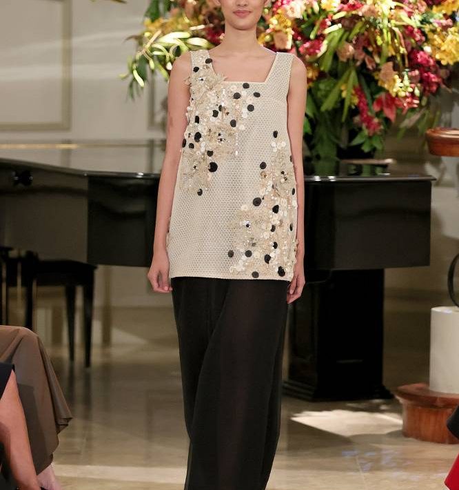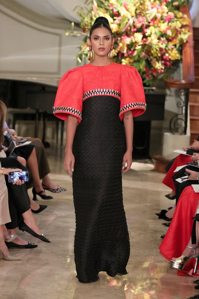 The men’s collection looked youthful with loose tunic tops with dropped sleeves paired with embroidered jusi city shorts. Cabral played with embellished bibs and vests as accents for shirts. One had to look at fine details such as a beaded bib on the front of the piña shirt and fine hand-pleating of the back for ease of movement.