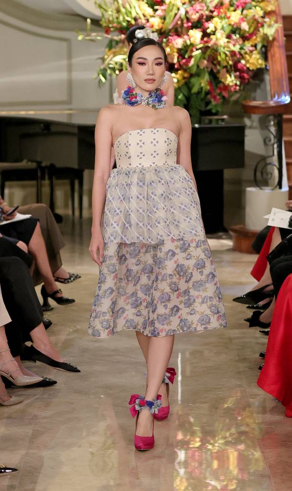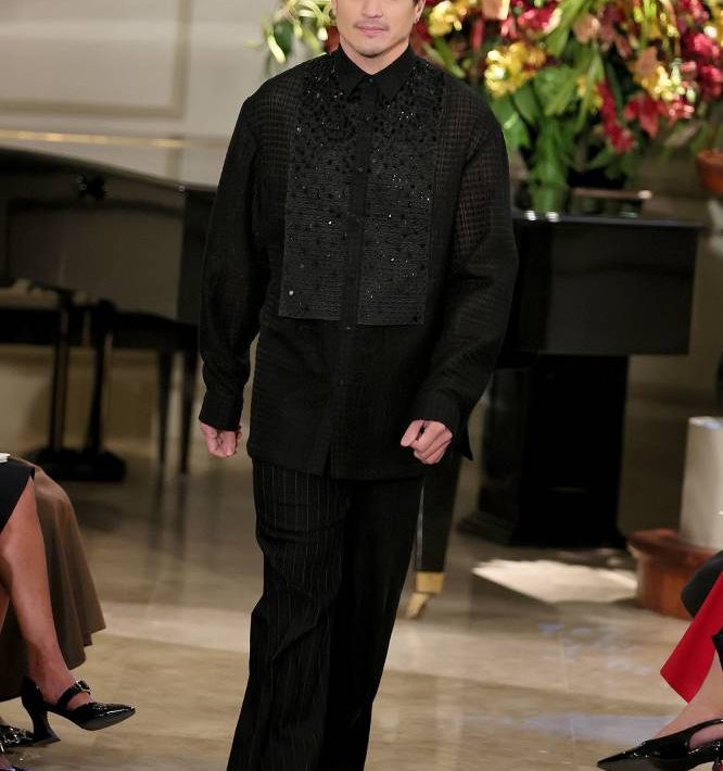 The crux of the collection, piña and jusi, was Cabral’s support for first lady Liza Marcos’ advocacy of preserving local weaving. He explained that a designer needs to combine piña with other fabrics to update the look.