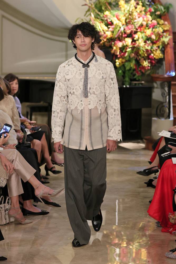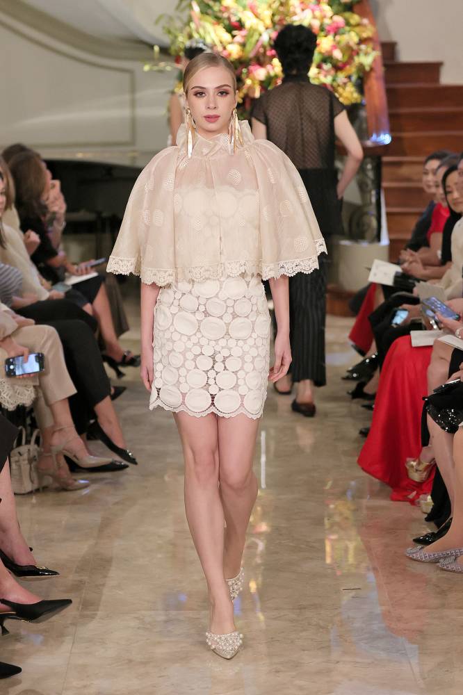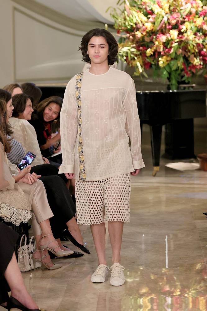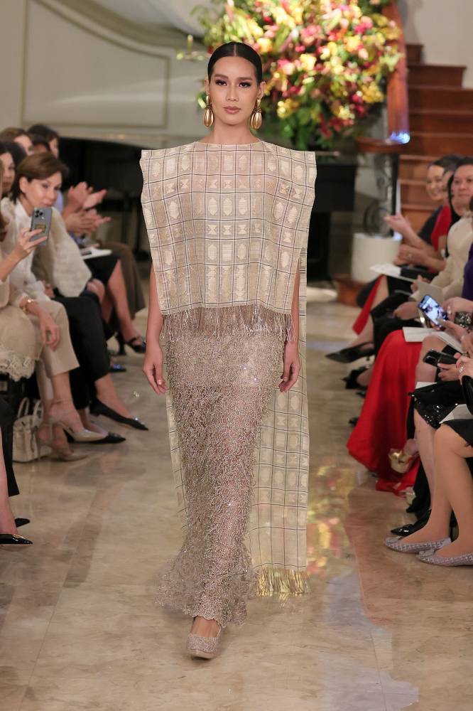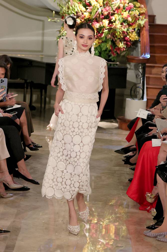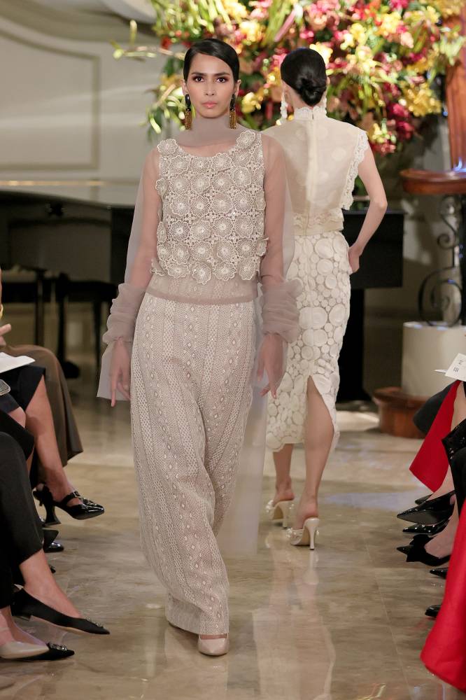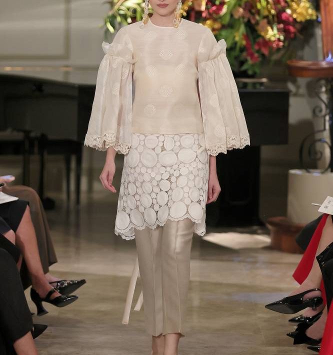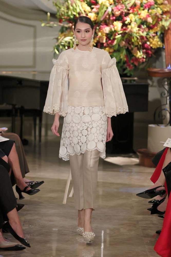 The all-beige collection featured jusi, a blend of local silk and vegetable fibers with calado or lace-like and mesh patterns, and bordado, ornamental embroidery, all made in Lumban, Laguna.