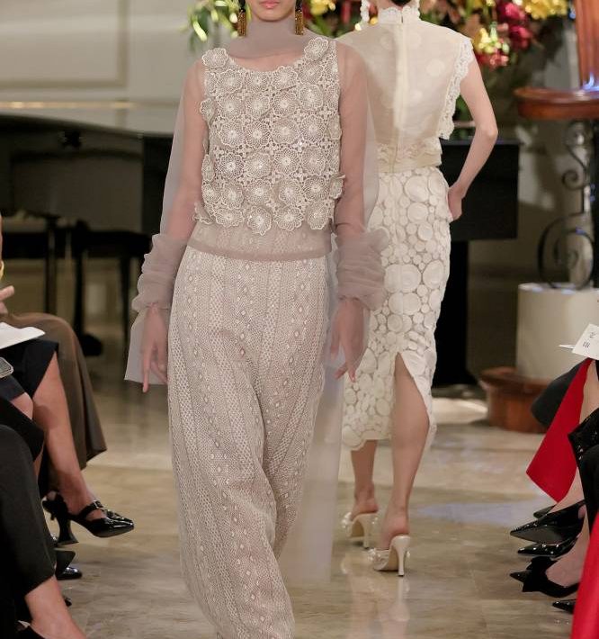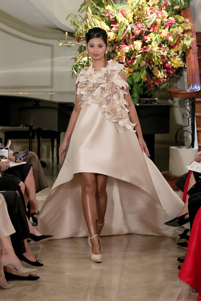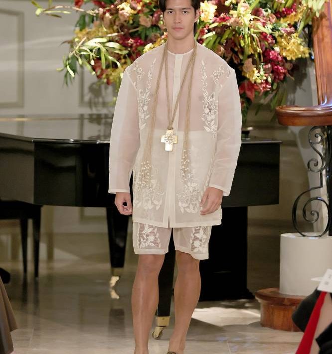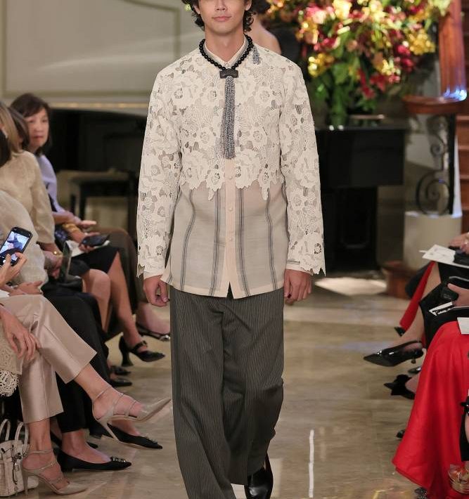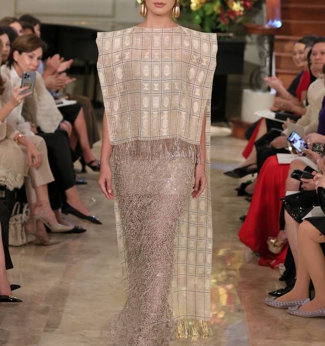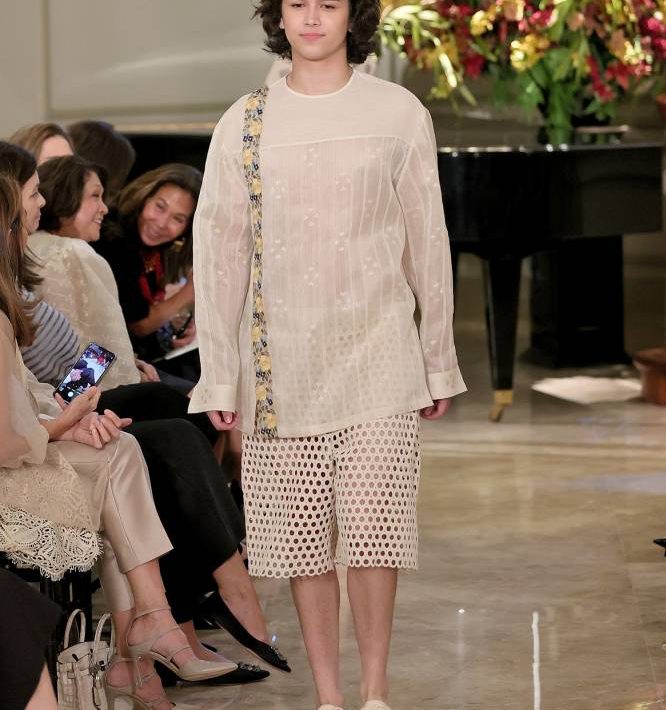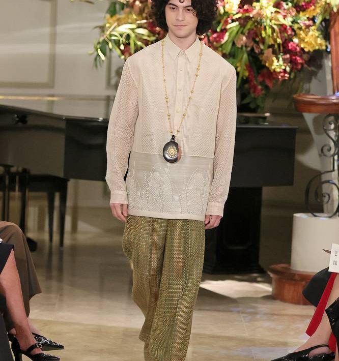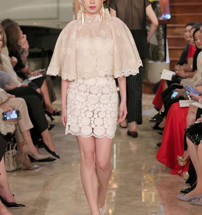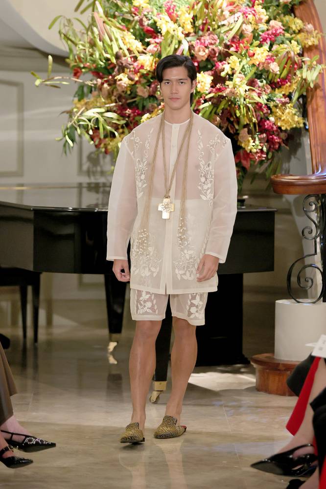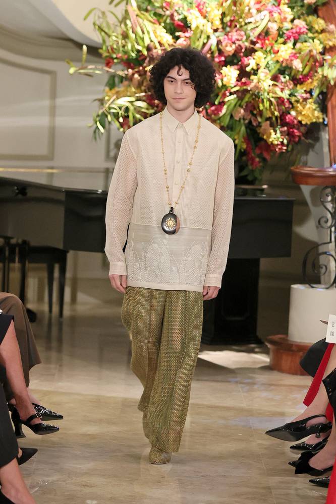 The all-beige collection featured jusi, a blend of local silk and vegetable fibers with calado or lace-like and mesh patterns, and bordado, ornamental embroidery, all made in Lumban, Laguna.