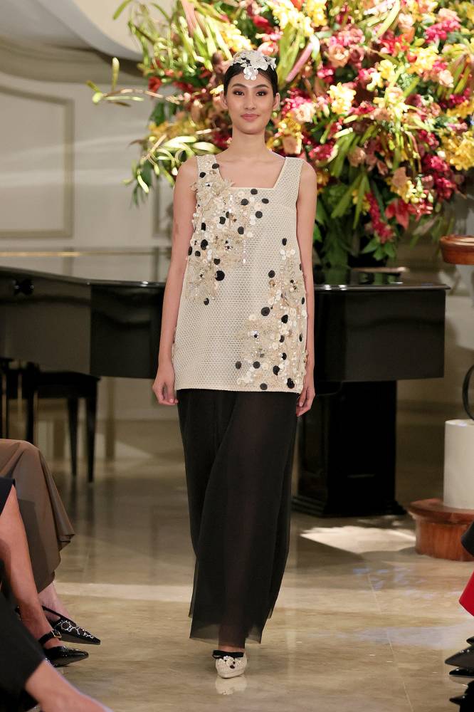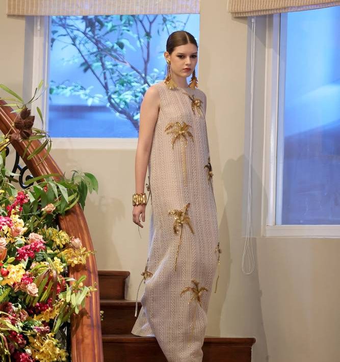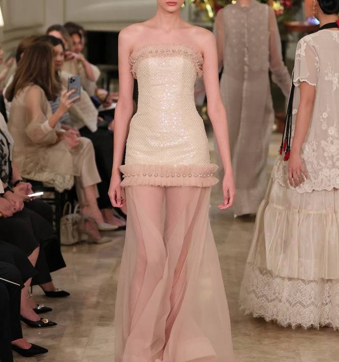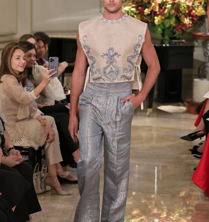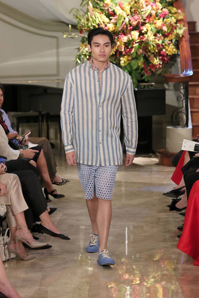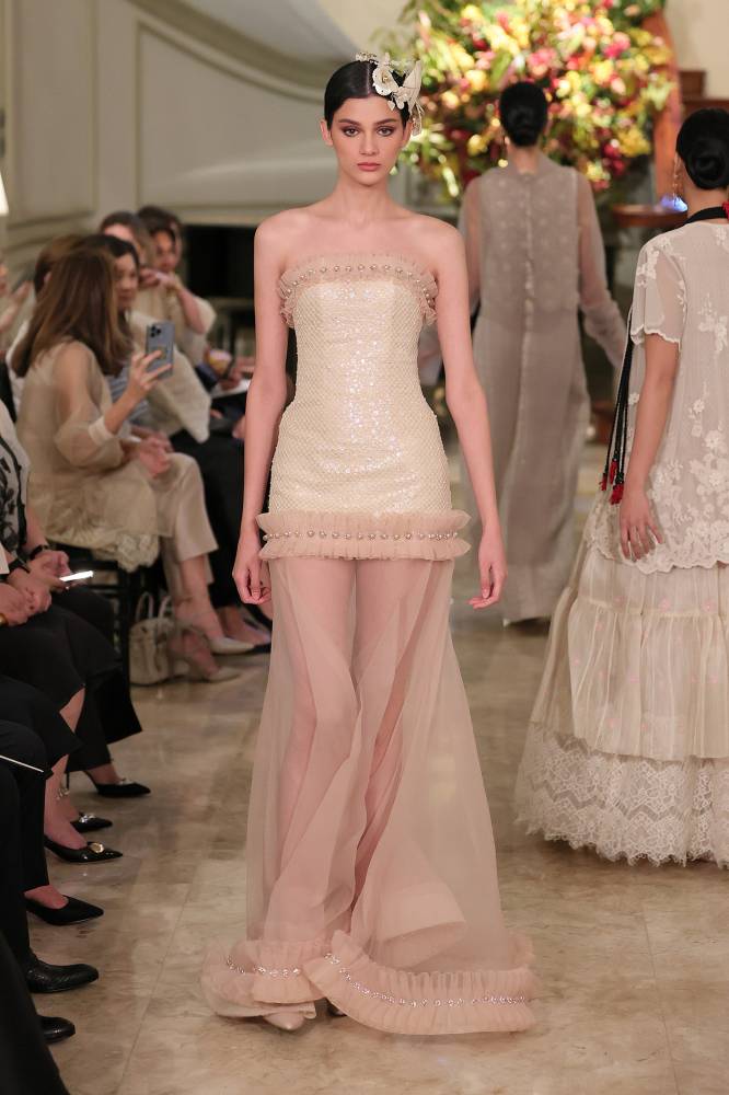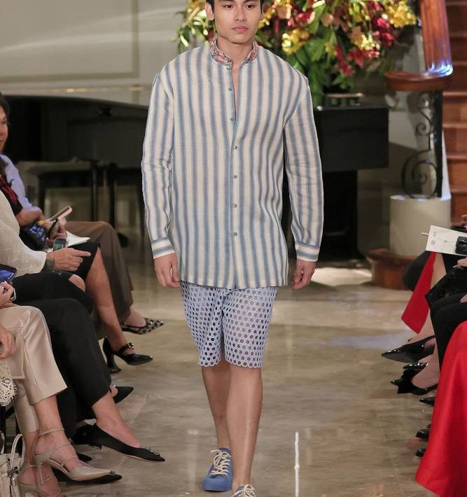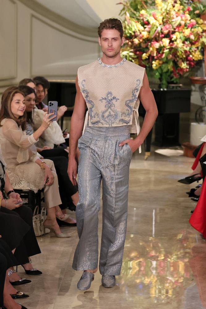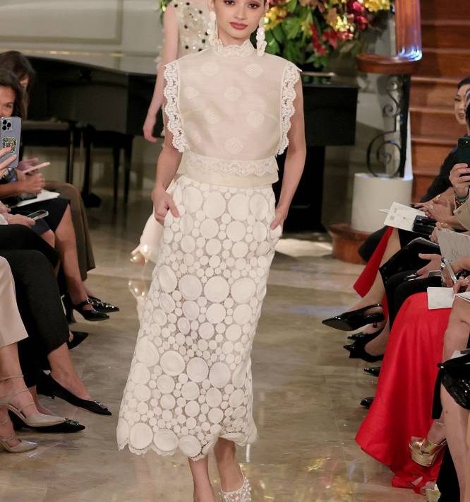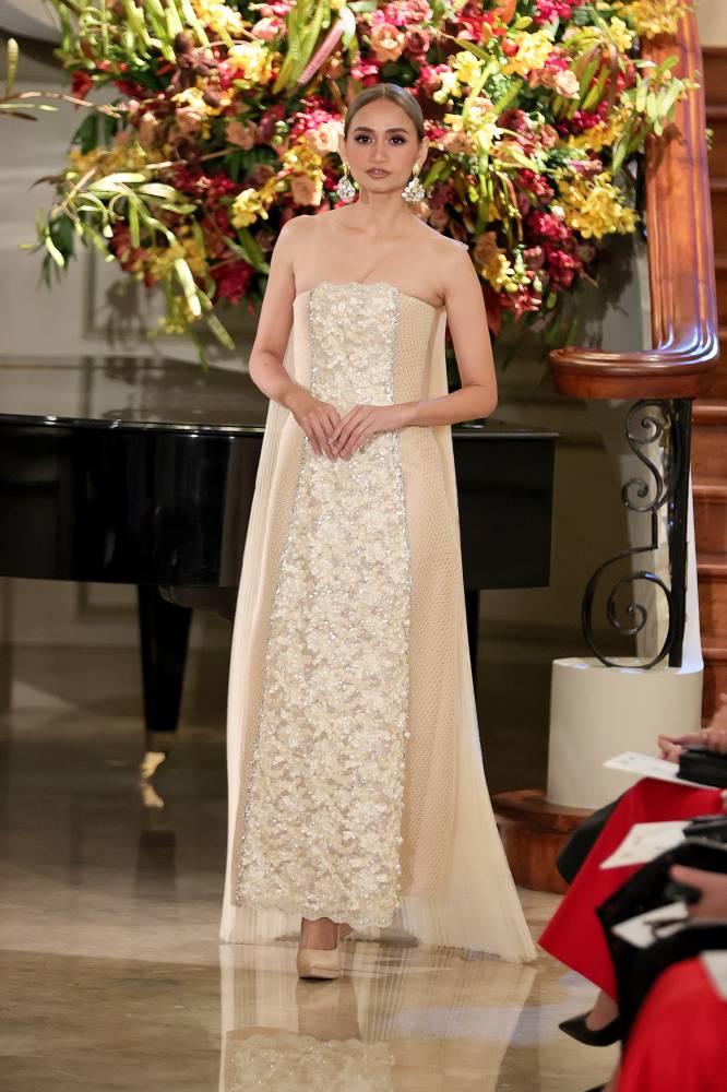 The all-beige collection featured jusi, a blend of local silk and vegetable fibers with calado or lace-like and mesh patterns, and bordado, ornamental embroidery, all made in Lumban, Laguna.
