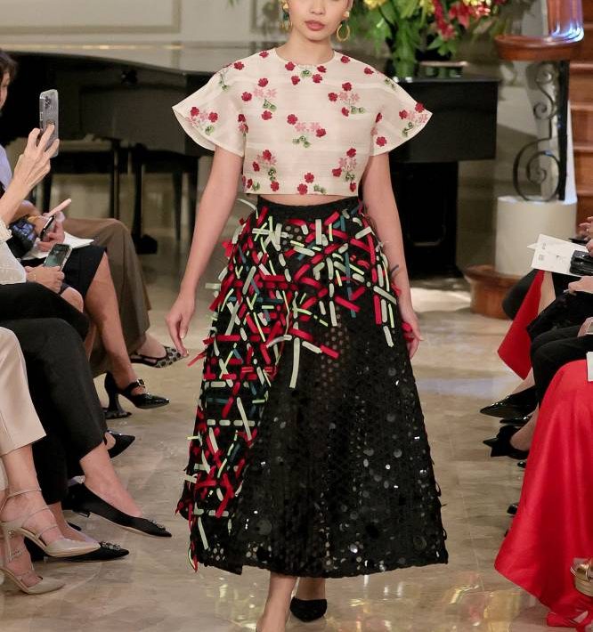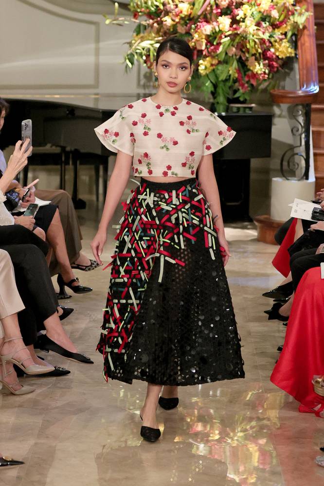 Fabric manipulations Cabral’s version of layering was combining several separates in different embroideries. An embroidered mesh top was teamed with a piña vest with lace appliqués and a sinuksok skirt over a vintage lace petticoat.