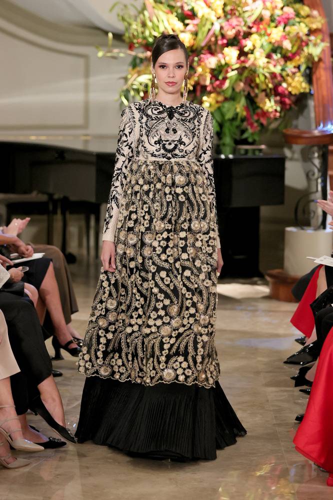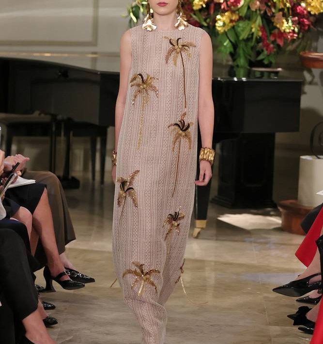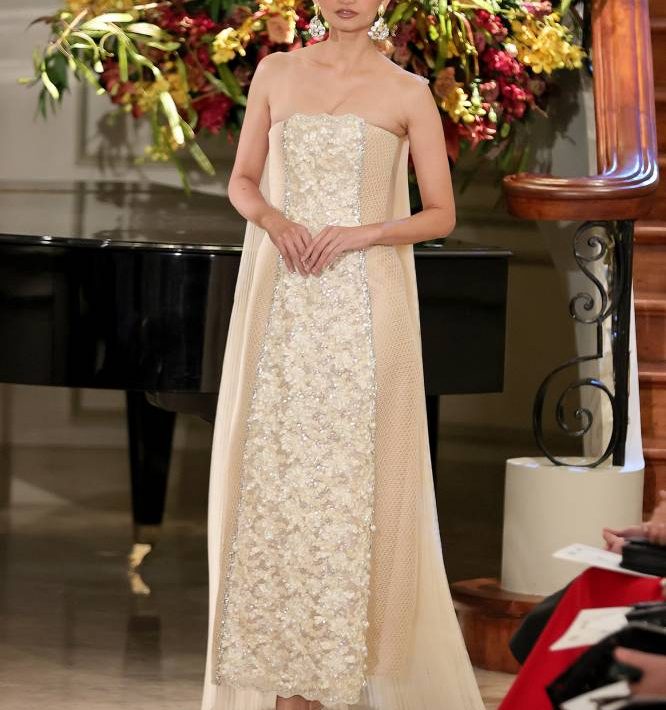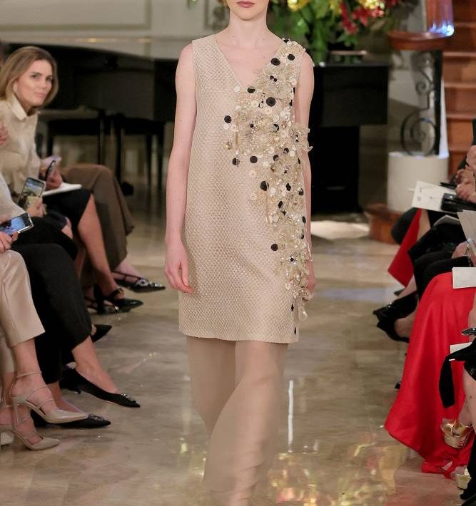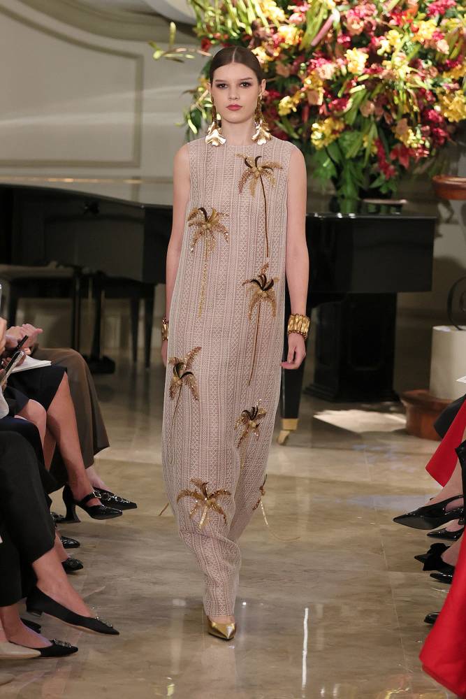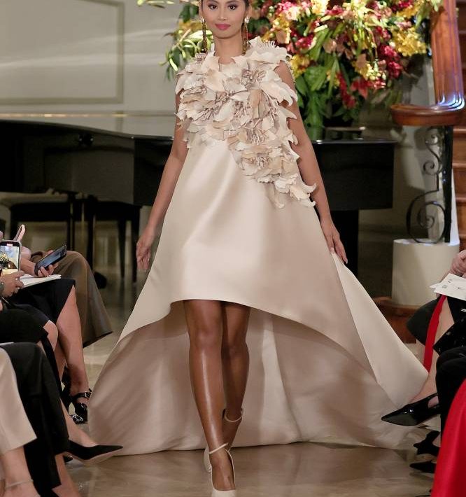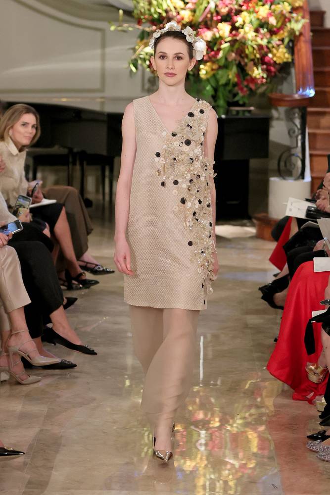 The show began with a beige Italian Mikado silk dress, embellished with repetitive floral cutouts. It had the same silk lining as the dress—as Salazar had taught him. Cabral said the challenges were in hiding the seams and making the perfect cutaway hemline that curved to the back and moved as if it were windblown.