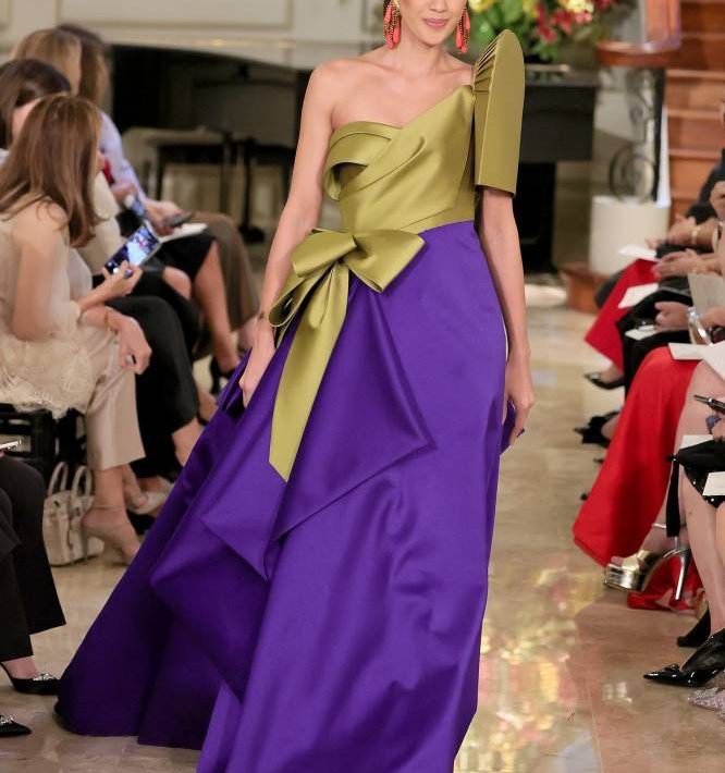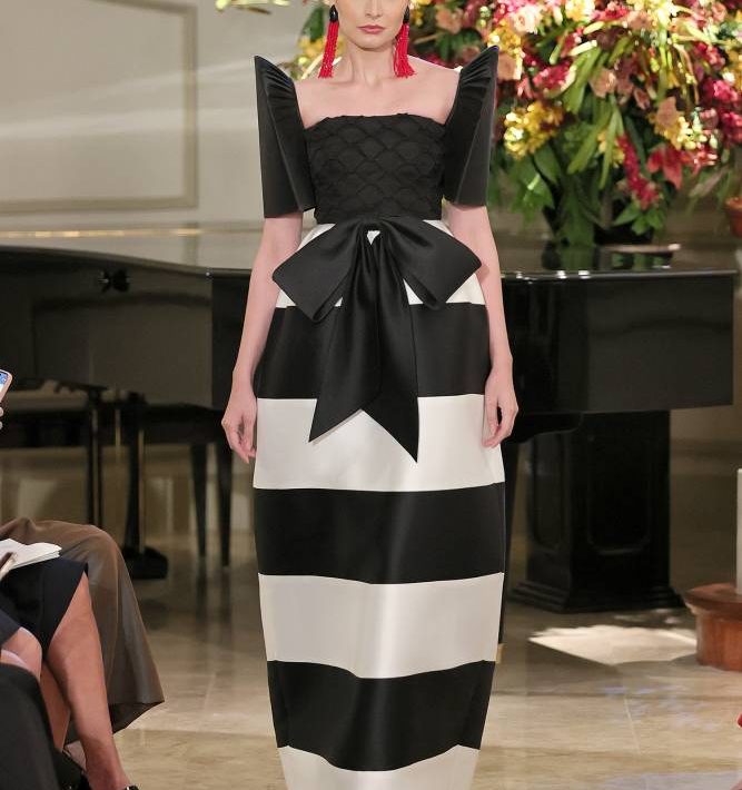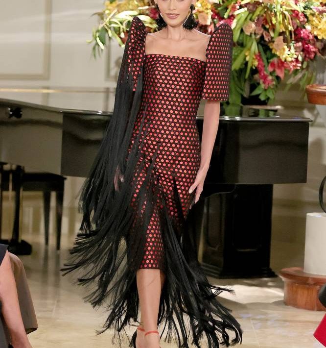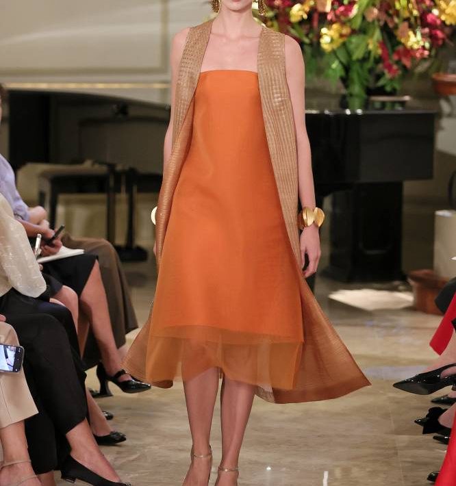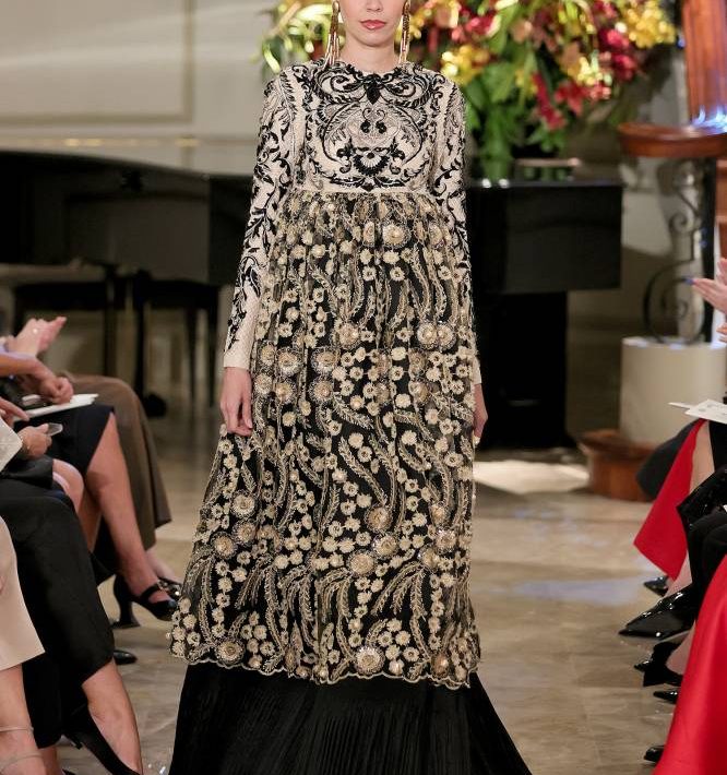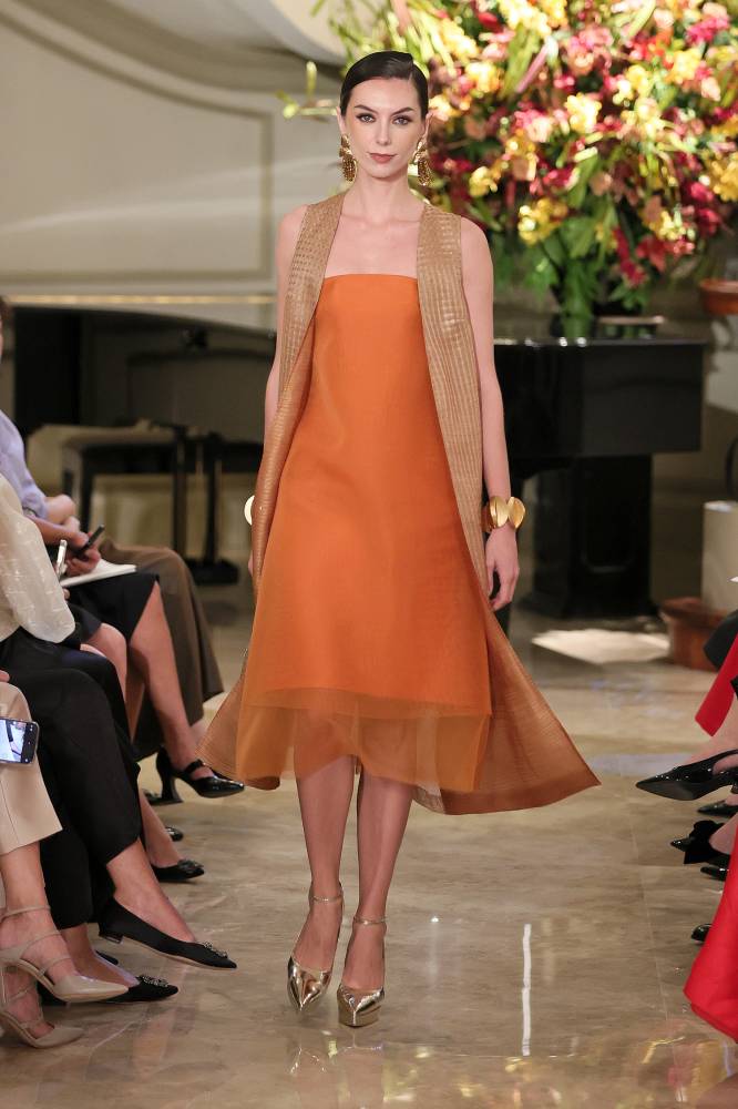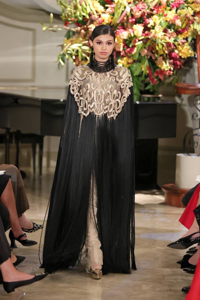 The show began with a beige Italian Mikado silk dress, embellished with repetitive floral cutouts. It had the same silk lining as the dress—as Salazar had taught him. Cabral said the challenges were in hiding the seams and making the perfect cutaway hemline that curved to the back and moved as if it were windblown.