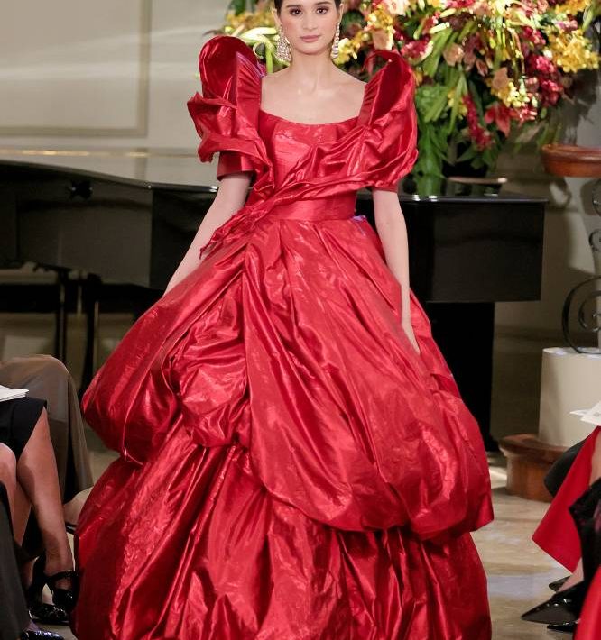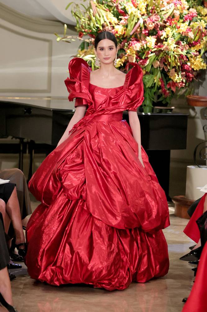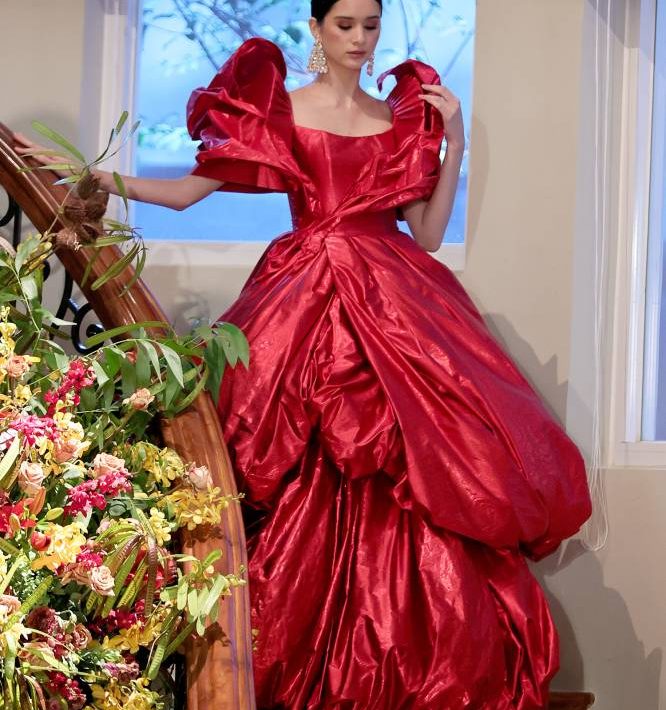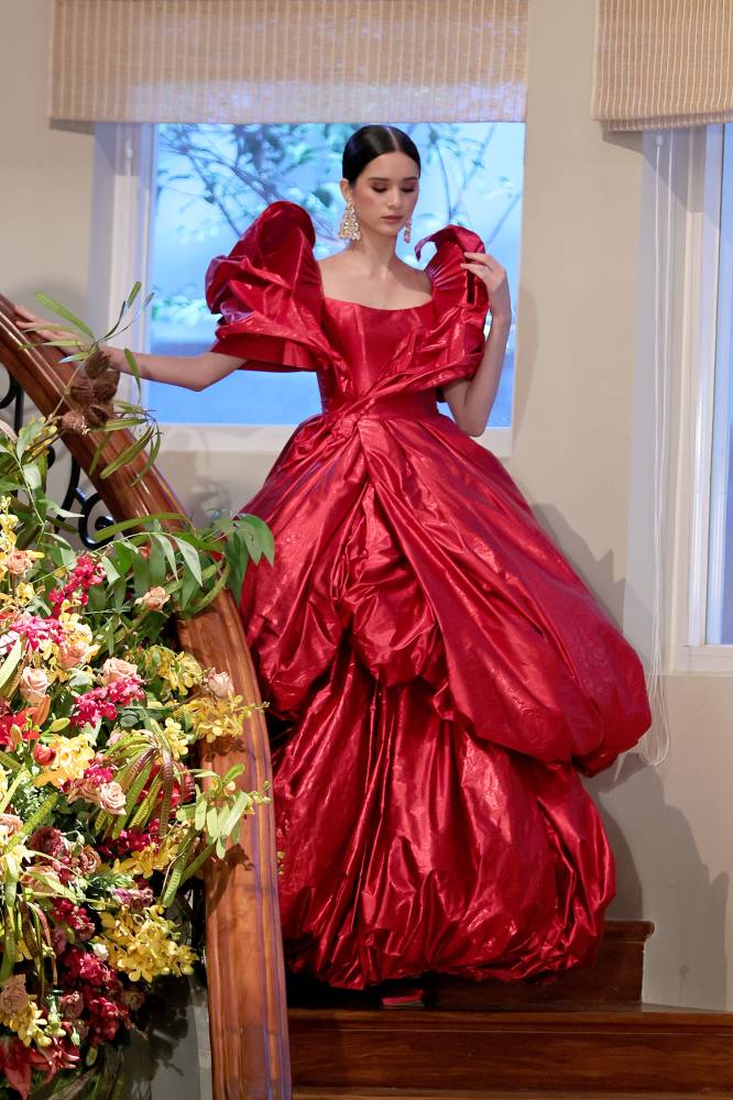 Another tour de force, a red silk terno with bouffant layers, was made with intricately shaped butterfly sleeves with folds that flowed into the torso. Like the beginning, the finale was understated but detailed—a fully beaded Maria Clara top with a well-constructed skirt.