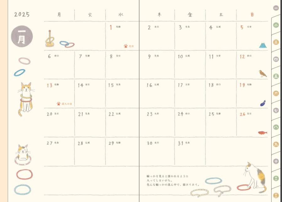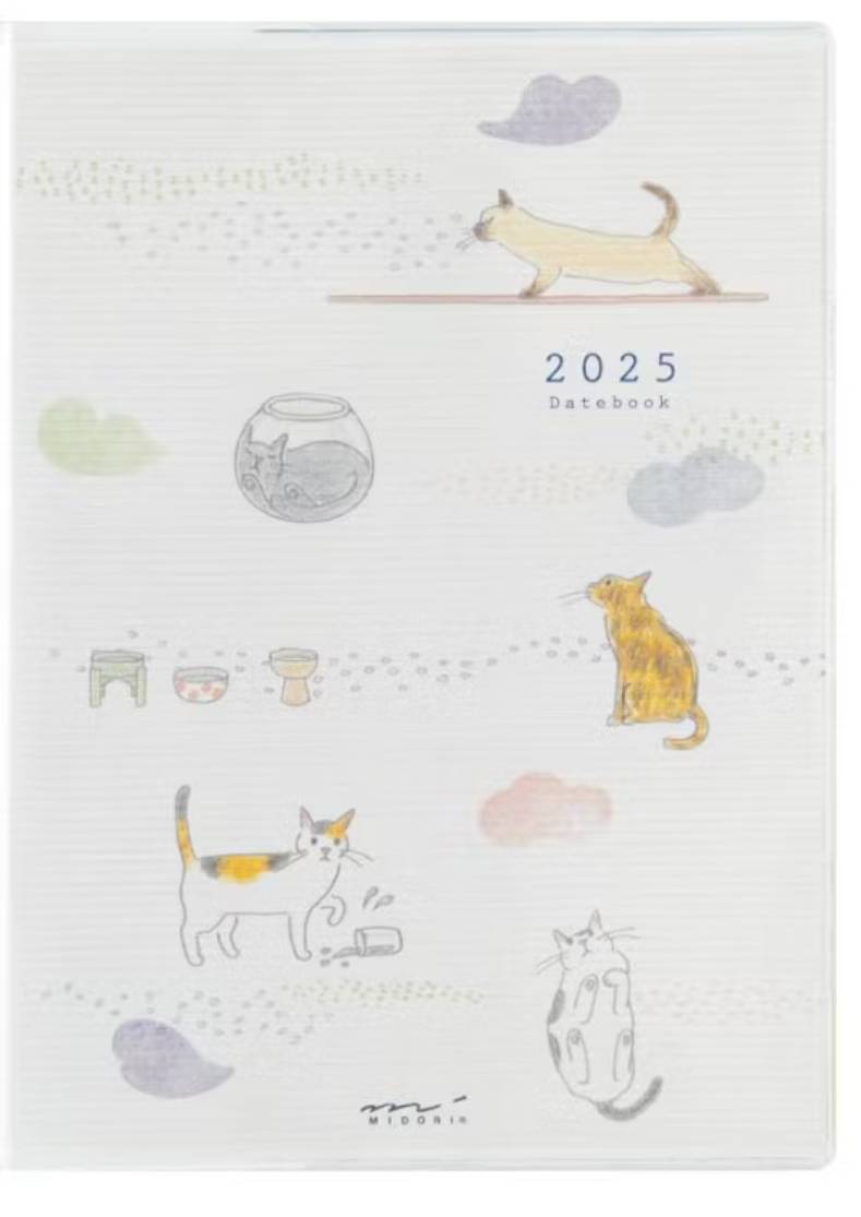 Cat lovers, this one’s for you. This cute Midori Pocket Diary features illustrations of cats on the cover and on its pages. It has monthly calendars from January 2025 to March 2026. There are weekly pages and extra graph pages as well.