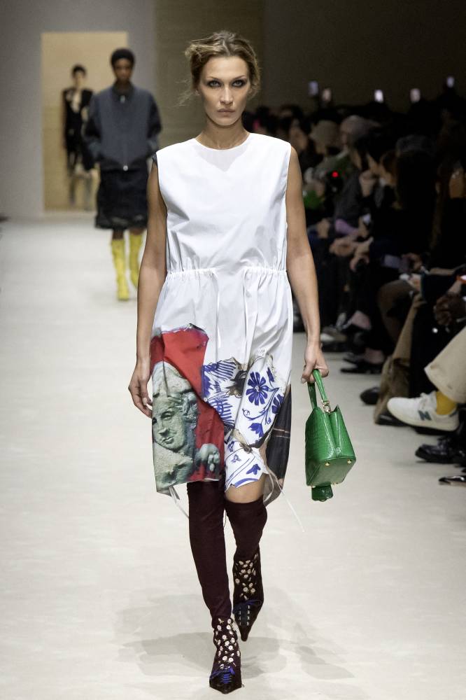 “I think that we like very much the idea that there are a lot of things coming together that do not necessarily give you what you expect,” Simons said backstage after the show, as model Bella Hadid enthusiastically kissed the hand of Prada.