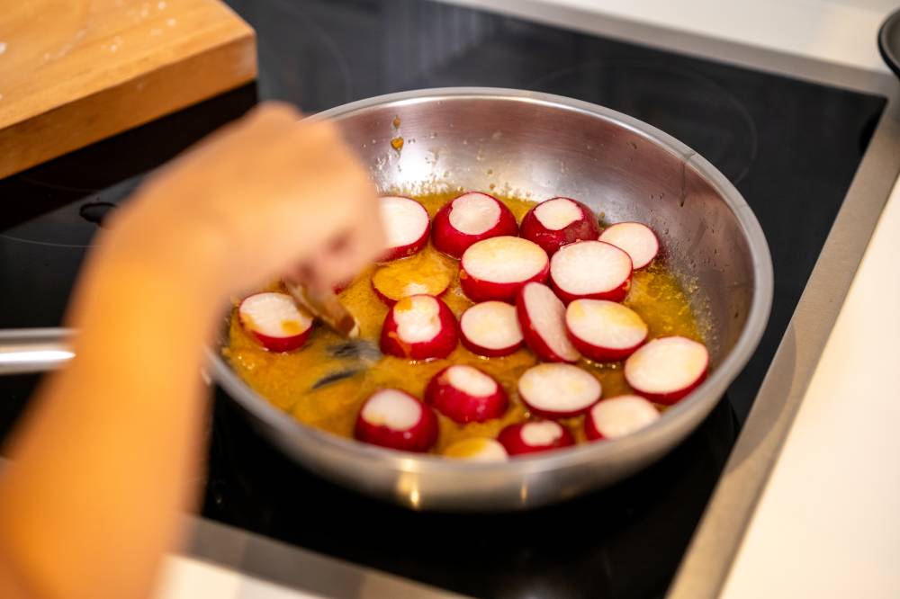 3. Add the miso paste, and add the radishes. If needed, add a dash of water to break down the miso paste.