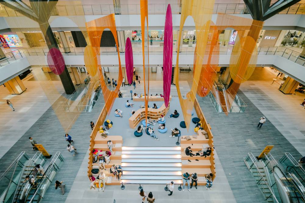 In the middle of a bustling mall that doubles as a central transport hub, a two-level structure rises like an open staircase. Framed by vertical slats, climb the stairs and find readers flipping through paperbacks, lounging on beanbags. From the ground level, little rooms show shelves brimming with book spines. Above the entire structure, an installation floats, forming orange and fuchsia geometric shapes, its wisps filtering the sunlight into soft, natural light. It makes the perfect light for reading.