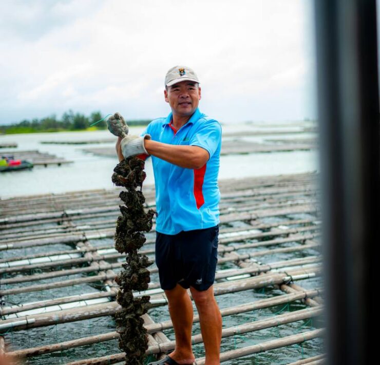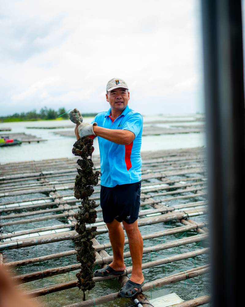 After dining on a seafood feast of shrimps, fish, squid and oysters, visitors board a chartered boat that takes them to the oyster farm—essentially bamboo rafts floating in tidal waters that hold the oysters underneath. The boat captain hoists up a string of growing oysters to show how oyster breeding is done. The boat then proceeds to a small deserted islet with squishy black sand teeming with clams, shellfish and small crabs, for a restful stop amid sea breeze and warm, gentle waves lapping the islet. During peak harvest season in summer, visitors may also hold their own oyster barbecues.