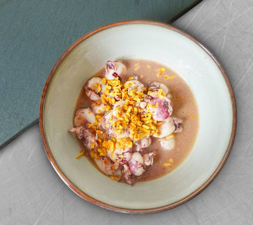 Add the baby squid, and quickly turn off the heat once the skin changes color.