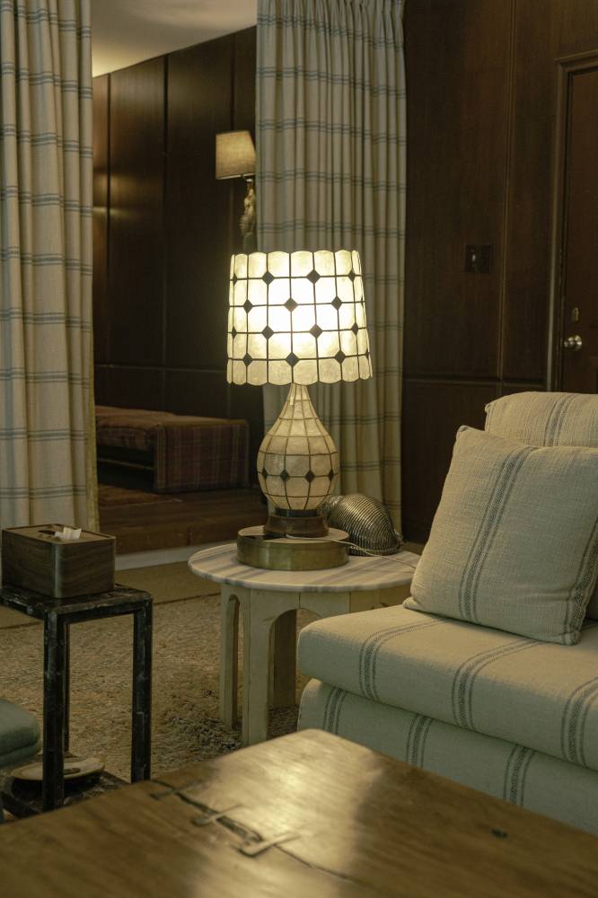 A mother of pearl lamp lights up the room