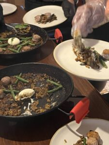 The chef and his team sent out Croquetas de Cecina, creamy croquettes topped with thin slices of air-dried and -cured beef; Arroz de Butifarra y Trompetas, paella served in a shallow pan with slices of spicy sausage and black trumpet mushrooms; and Taco de Lengua, a soft corn tortilla topped with tender beef tongue and spicy mango—best eaten with one’s hands. In between each dish, Del Hoyo Gomez came out to give a brief description of the different flavors and cooking processes used.