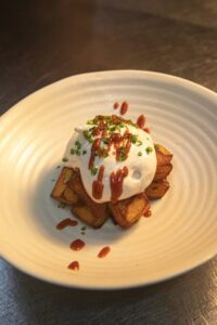 We started with individual plates of Tiradito de Salmon, a refreshing seafood salad made with salmon and topped with coriander foam, the chef’s take on molecular gastronomy. This was followed by Del Hoyo Gomez’s updated Patatas Bravas, dice-like cubes that were actually multiple layers of sliced potatoes tossed in a spicy-savory sauce made with black garlic aioli and sriracha. We sampled several other dishes that afternoon, but this one was the hands-down winner.