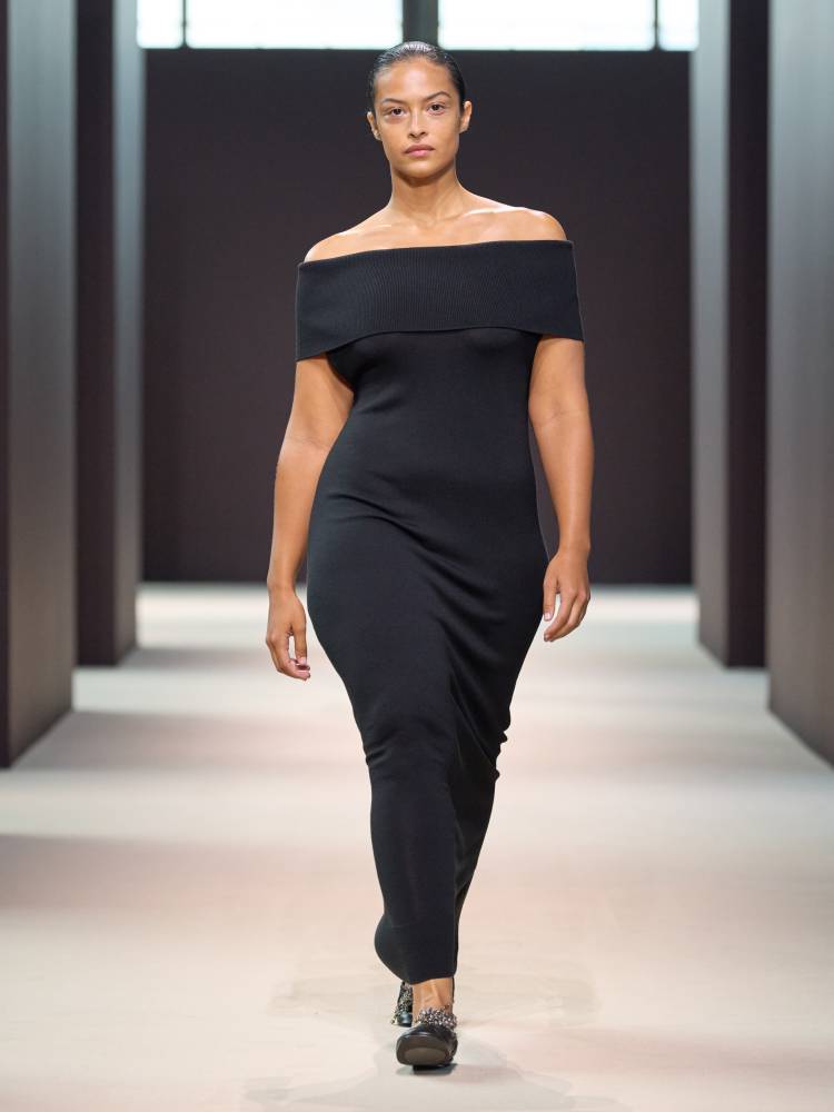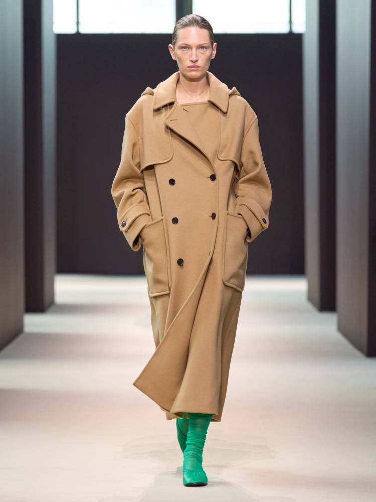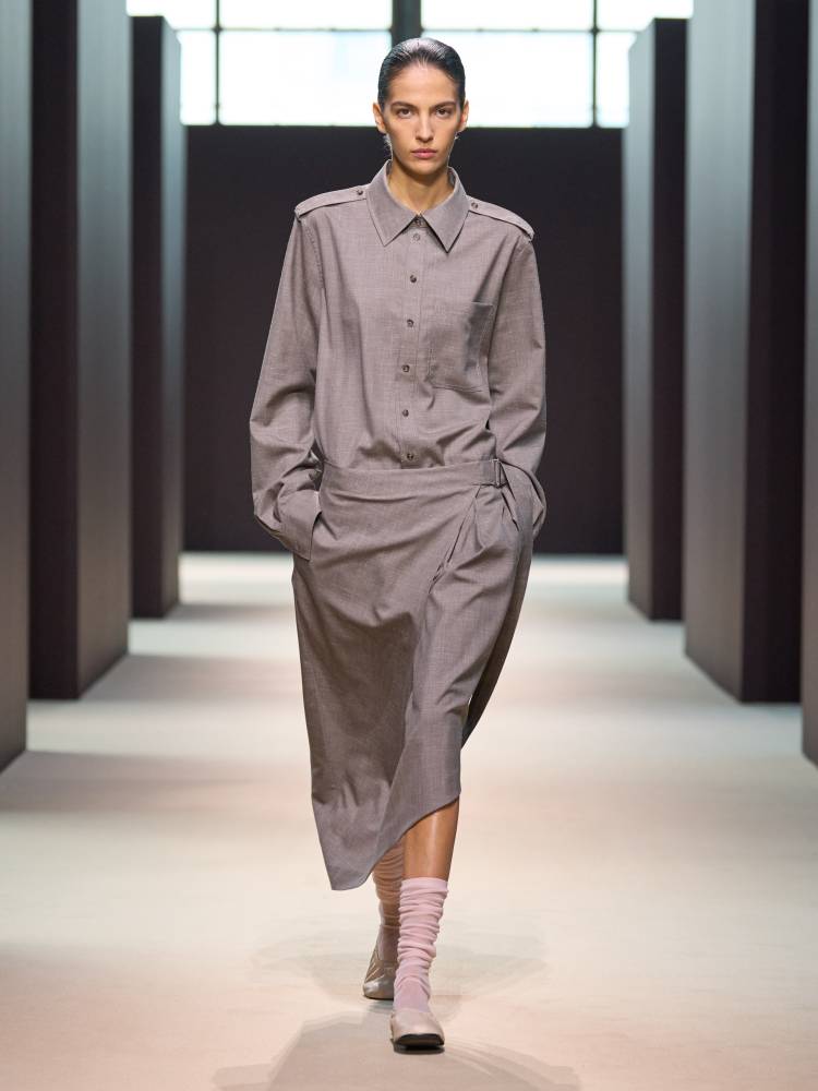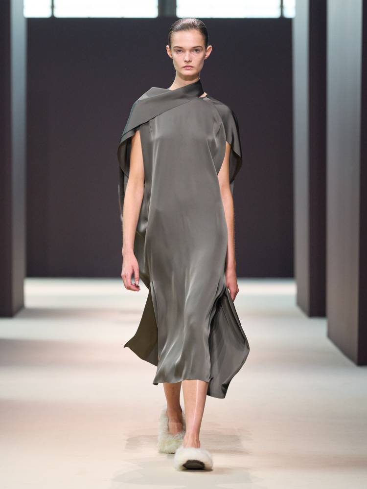 Elegantly refined, sheer separates and floor-length dresses featured alongside relaxed wool coordinates, duffle coats, smooth leather jackets and shearling.