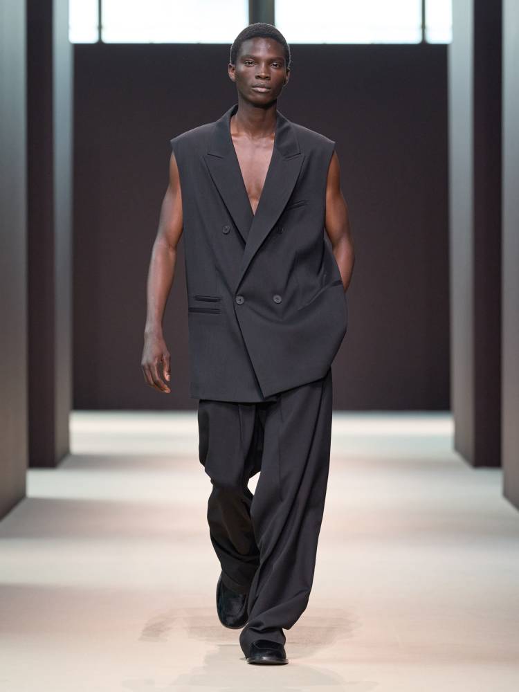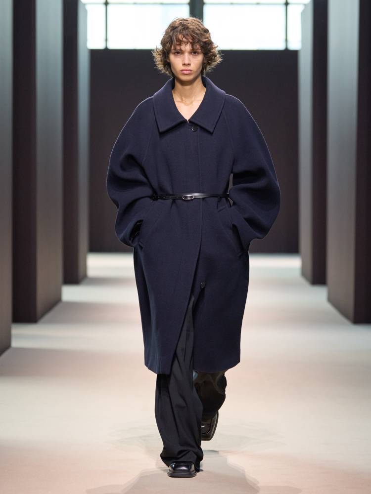Menswear focuses on reinventing classic wardrobe staples. Formal tailoring is relaxed for day-to-evening dressing with barrel-leg trousers that are cut to fit loosely on the body, worn with draped silk shirts for a softer aesthetic. Fluid trousers are paired with oversized jackets featuring leather detailing, while tonal looks combine suiting with tactile cashmere layers.