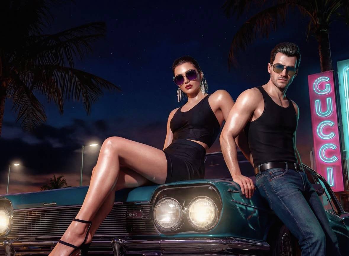 To everyone’s surprise, Gucci released a series of teaser visuals on Instagram for their upcoming Primavera show in Milan, offering a mood board of what to expect from the collection. The campaign blends real photography with AI-generated imagery, including a shot of worn Horsebit loafers and Michelangelo’s David, a 1979 Cadillac Seville referencing Aldo Gucci’s historic collaboration with the brand, and a couple perched on a car hood with palm trees and a glowing Gucci sign in the background. One image closely mirrors a GTA VI teaser, seemingly recreated in Midjourney, while another shows a woman in a red gown stepping out of a black car, appearing as if a stock photo had been run through AI to bypass licensing restrictions.