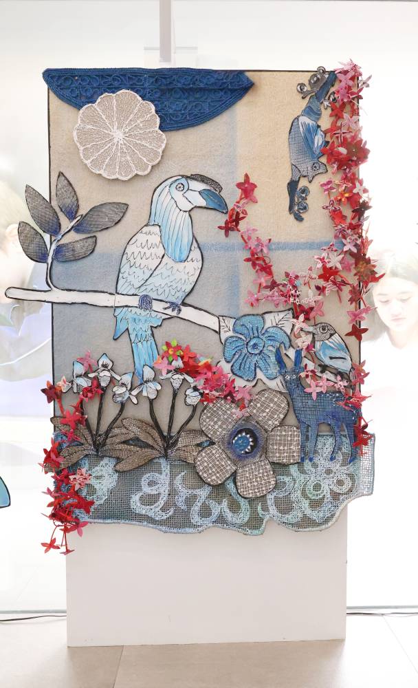 Each panel is made using reused materials, emphasizing BSM’s sustainability goals, while highlighting textiles and materials native to the Philippines. Manahan included abaca, sinamay, lace, or “burda,” and how it got here, along with the different patterns and textures included in the artwork.