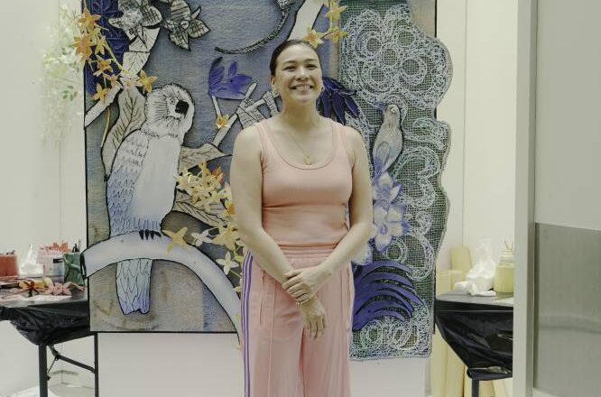 Each panel is made using reused materials, emphasizing BSM’s sustainability goals, while highlighting textiles and materials native to the Philippines. Manahan included abaca, sinamay, lace, or “burda,” and how it got here, along with the different patterns and textures included in the artwork.
