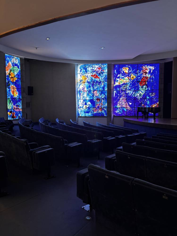 At the Chagall Museums, visitors can watch an hour-long film that narrates his life and work, projected in a room illuminated by his luminous stained-glass windows.