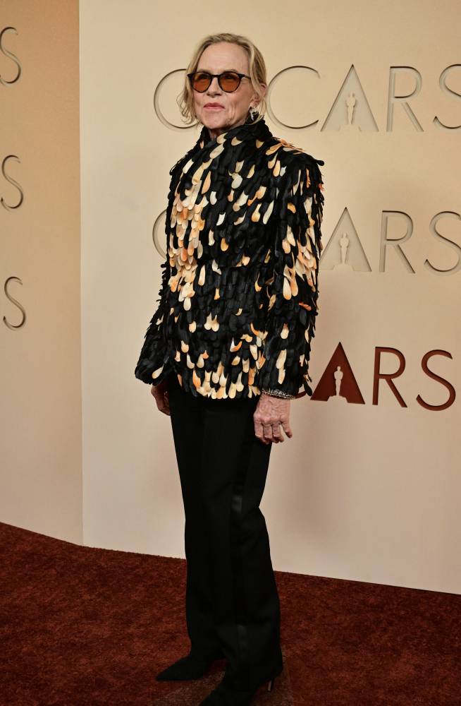 Amy Madigan took a slightly different route on the carpet, wearing a statement Dior coat covered in layered, feather-like embellishments in shades of black, cream, and amber.