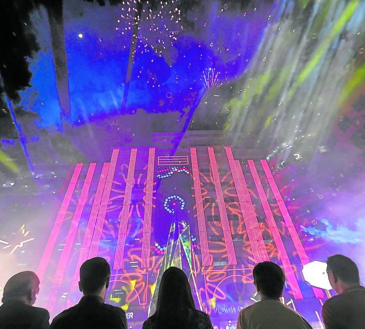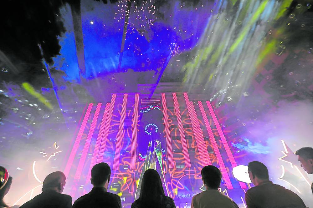 EASTWOOD CITY SPECTRA / NOVEMBER 22, 2023(L-R) Denisse Malong, General Manager of Eastwood City, Graham Coates, Head of Megaworld Lifestyle Malls, Kevon Tan, CEO of Alliance Global Group Inc, parent company of Megaworld Corp., Quezon City Mayor Joy Belmonte, Tetta Tirona, OIC Quezon City Tourism Department, Atty. Thomas De Castro, District 3 Action Officer and Tyrone Tan, Cluster Manager of Megaworld Lifestyle Malls, lead the launching of Eastwood City's "Holiday Spectra", a dancing light show on Tuesday night, November 21, 2023 in Libis, Quezon City.INQUIRER PHOTO / GRIG C. MONTEGRANDE