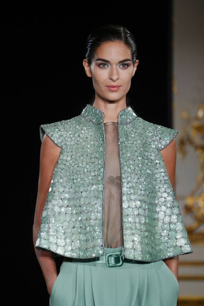 On color, many houses sat in quiet tones—blush, pale pink, sand, celadon—and let texture carry the drama. Armani Privé’s palette was all nuance: jade and soft pastels, controlled and clean. Even the guests played along: Kate Hudson arrived for Armani Privé in a collared baby-pink sequined top with black velvet pants, turning the pastel story into a paparazzi-ready uniform.